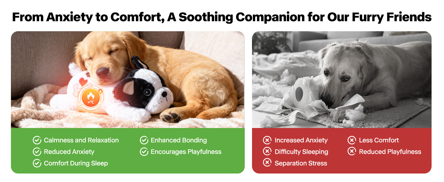 Realistic Heartbeat Simulation: This innovative plush dog toy is designed with a heartbeat device that effectively mimics a real mother's natural beat.This feature is especially beneficial for puppies experiencing separation anxiety or adjusting to new environments,as it provides a sense of security and comfort,helping them relax and feel less alone
