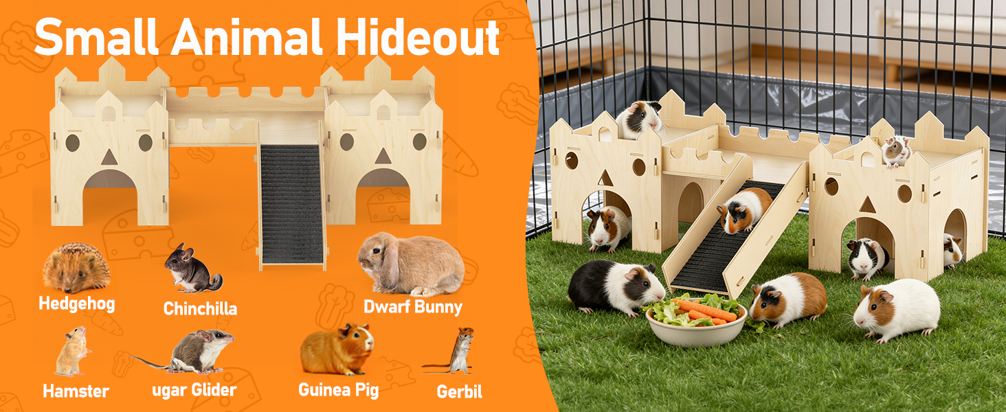 Versatile Habitat: Perfect as a cozy hideaway, stimulating playground, or a relaxing elevated lounge. Our guinea pig hides complements cage or playpen setup, providing enrichment for happier, healthier pets. Considering the doorway size, it's not suitable for adult rabbits, but it can be a sweet house for small pets such as guinea pigs, hamsters, gerbils, hedgehogs, and dawrf bunnies. Its castle like appearance is definitely a beautiful decoration scenery in your home.