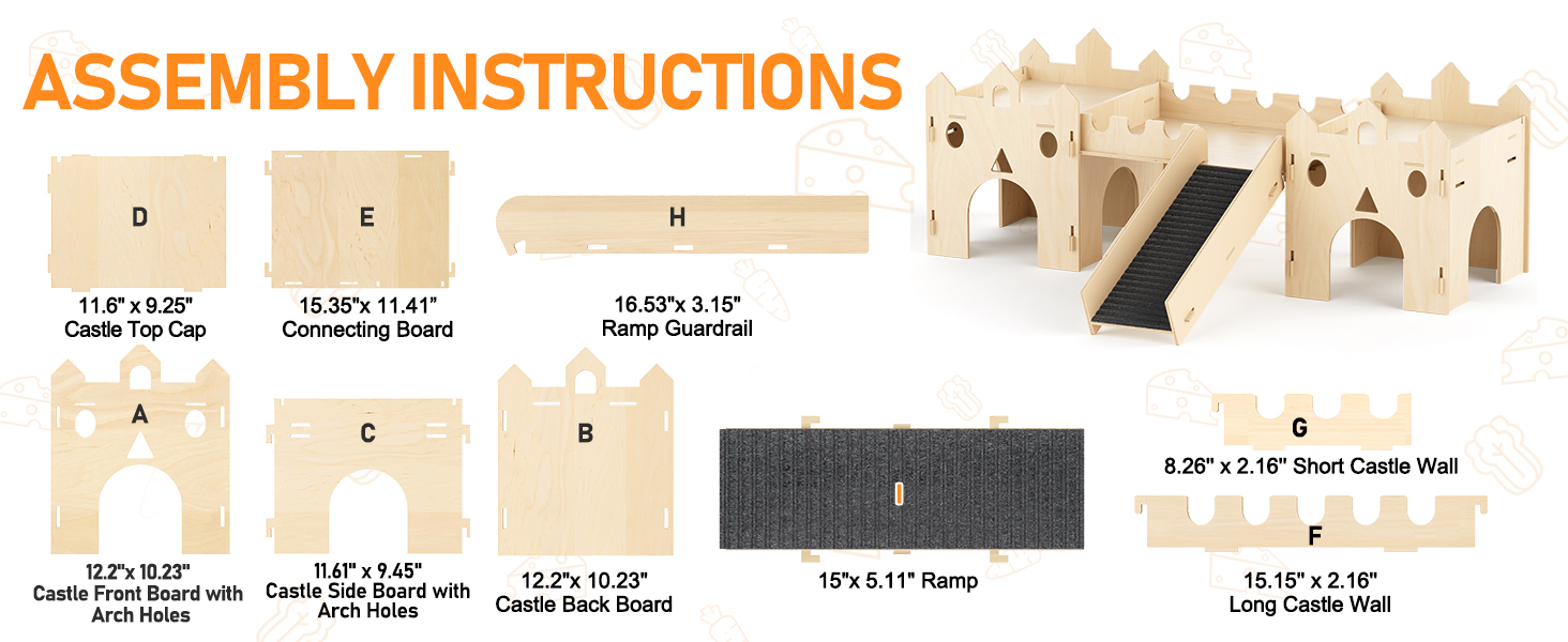 Easy Assembly & Cleaning: All boards can be inserted through mortise and tenon or plug-in structure, without the need for extra nails or glue. The instruction manual reveals the naming and installation sequence of each component. The video on the link will also introduce how to install hamster house. Features detachable components, easily separate ramp for quick wipe-downs, no more struggling with nailed-fixing structures.