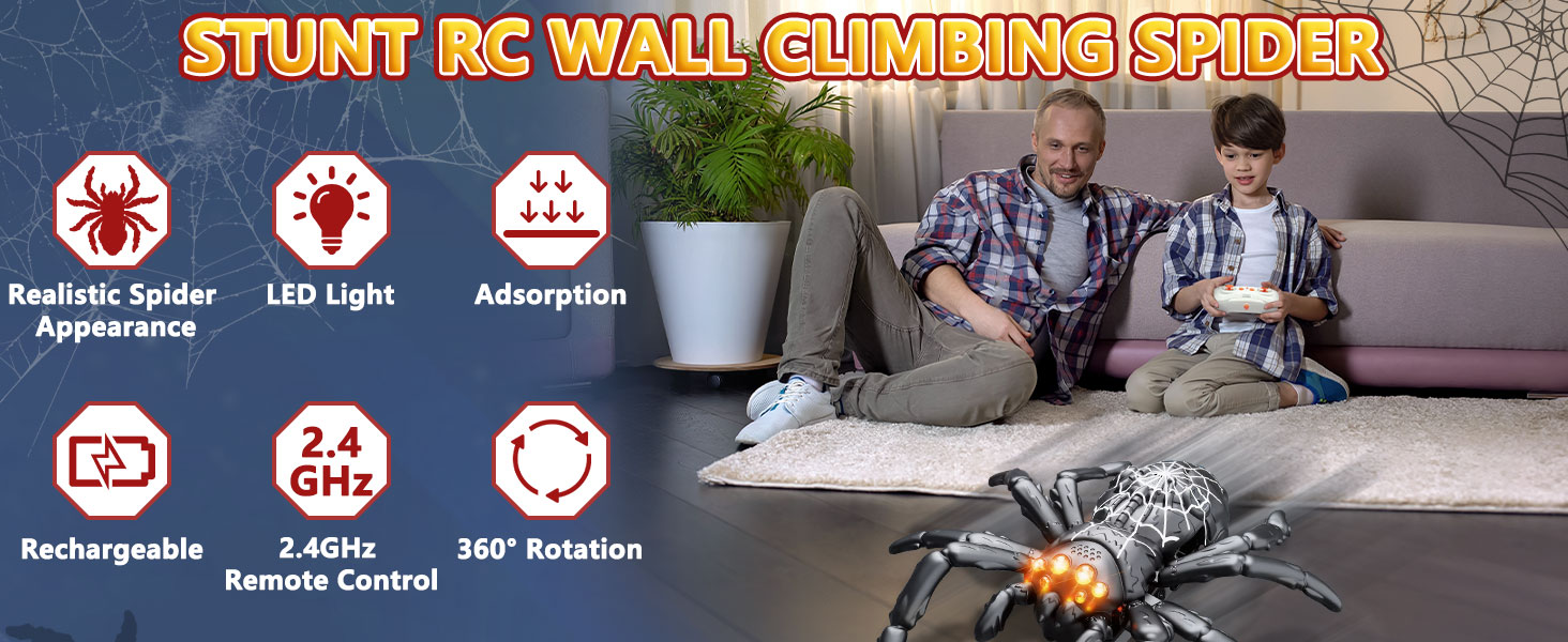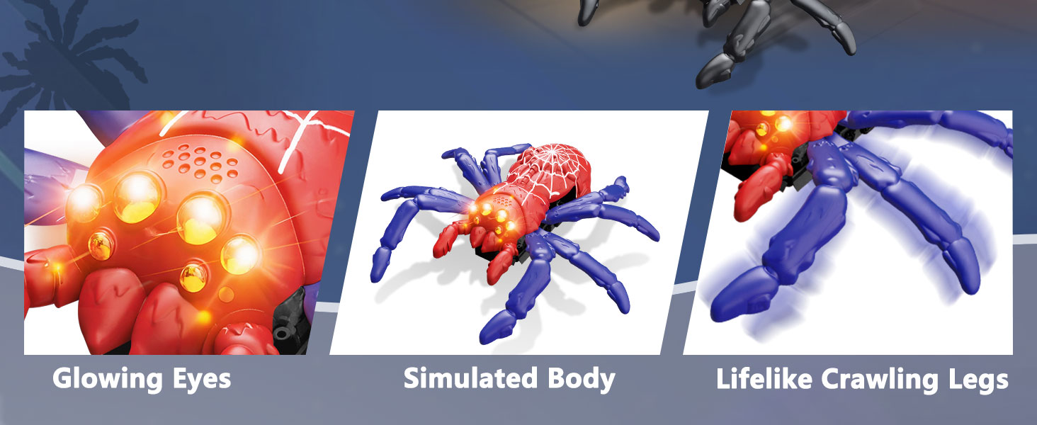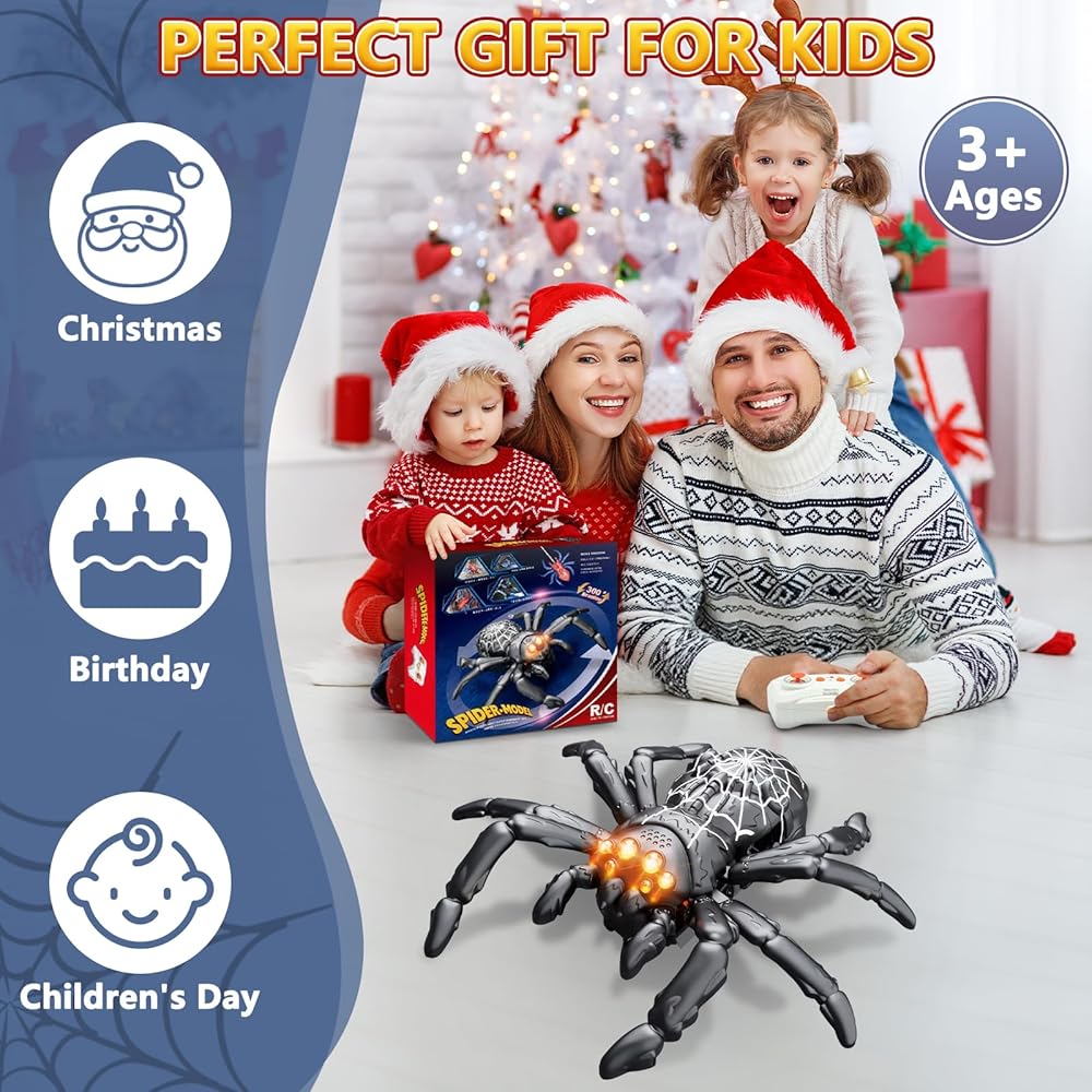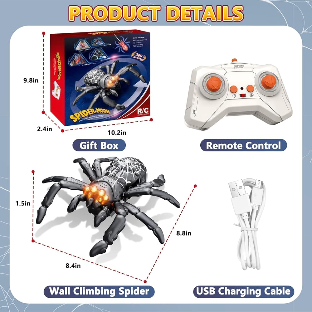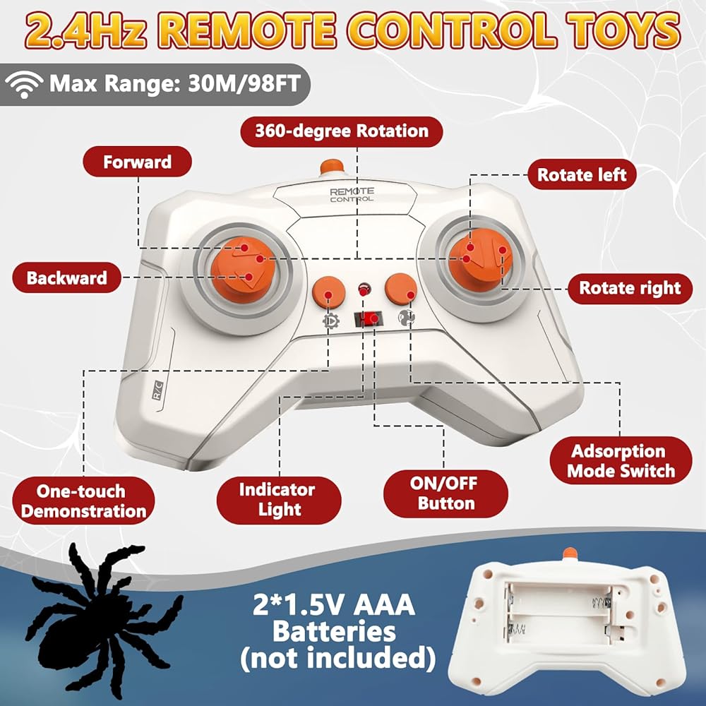 • 🎮 جهاز تحكم عن بعد سهل الاستخدام: مع جهاز تحكم عن بعد بسيط وسهل الاستخدام، يمكن للأطفال تحريك العنكبوت بسهولة للأمام والخلف واليسار واليمين، وحتى أداء دورات ممتعة بزاوية 360 درجة. يصل نطاق التحكم فيها إلى 98 قدمًا (30 مترًا)، مما يسمح باللعب لمسافات طويلة. (ملاحظة: تتطلب بطاريتين AAA، غير متضمنتين.)