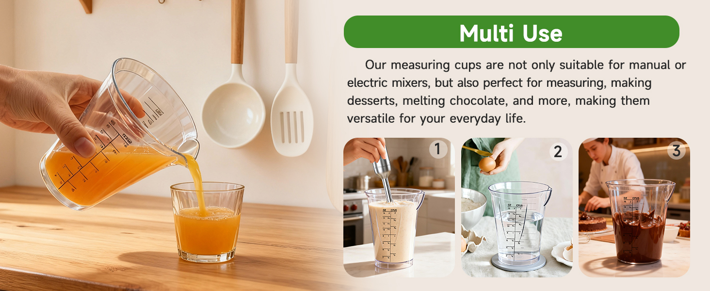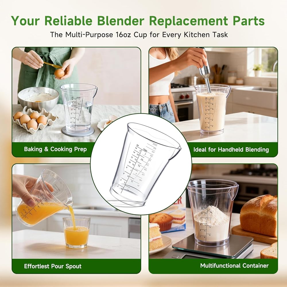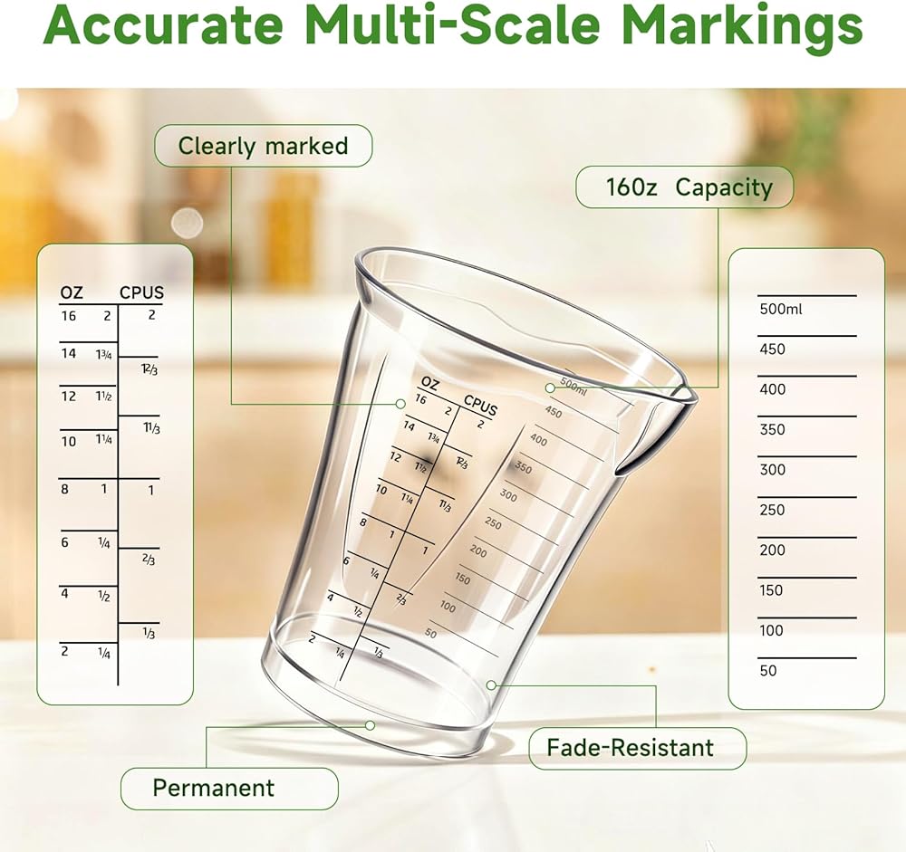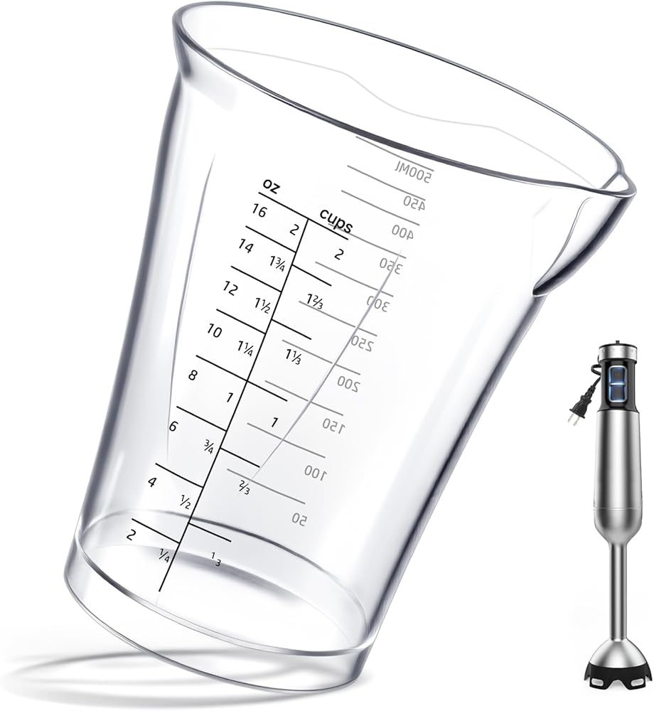 【Savory Kitchen Companion】 Hand blender cup, Stick blender replacement cup is a practical kitchen tool that precisely measures up to 500ml and pairs seamlessly with handheld/electric mixing wands. It effortlessly handles blending sauces, shakes, soups, and baking batters all in one go.