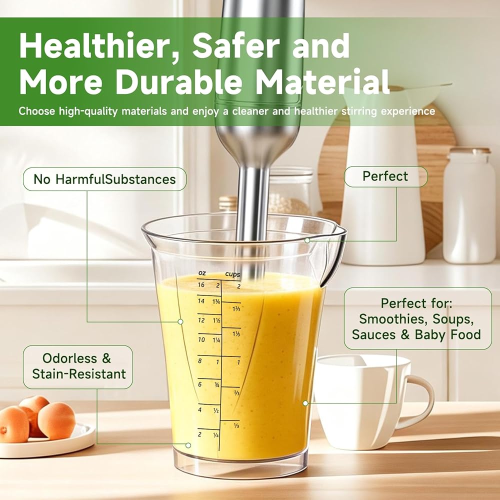 【Convenient Cleaning and User Experience】 Immersion Blender Cup, Hand blender cup replacement, smooth plastic, stains don't easily adhere, making cleaning extremely easy. Simply rinse with water after use, or machine wash directly in the dishwasher. Its lightweight design makes it easy to hold, pour, and store, balancing ease of cleaning with convenient operation. It's a reliable and thoughtful helper in your kitchen.