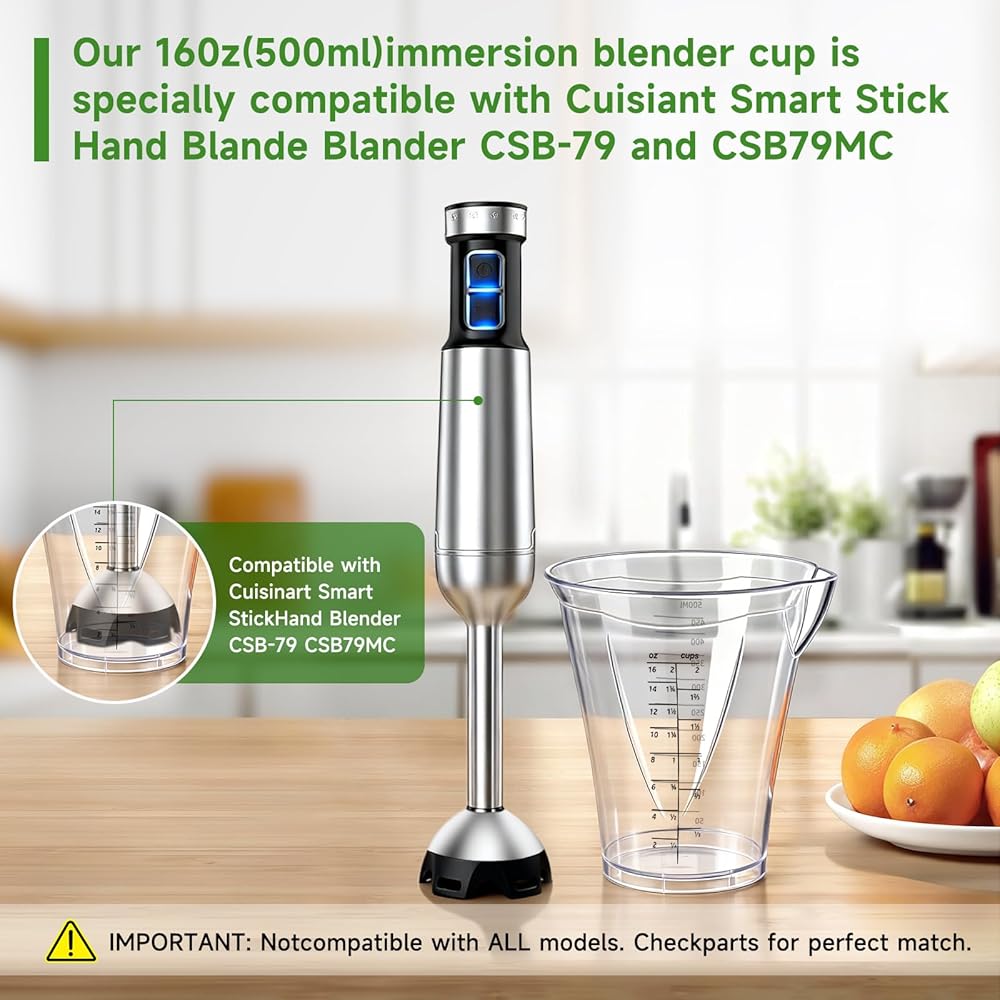 【Precise Product Compatibility】 Hand Blender Cup Replacement, CSB-79, Blender cup cuisinart replacement compatible with the 500ml measuring cup accessory specifically designed for the Cuisinart Smart Stick series handheld blenders (models CSB-79 / CSB-79MC). Its precision-designed interface ensures a secure and seamless connection with the original handle, guaranteeing efficient and safe blending. Before purchasing, please verify your blender model to ensure perfect compatibility and the best user experience.