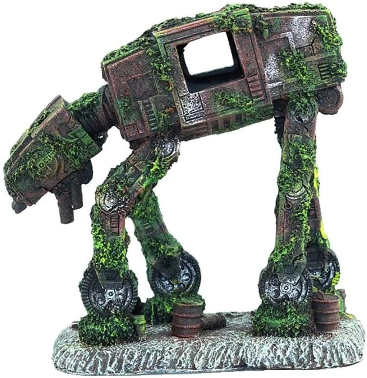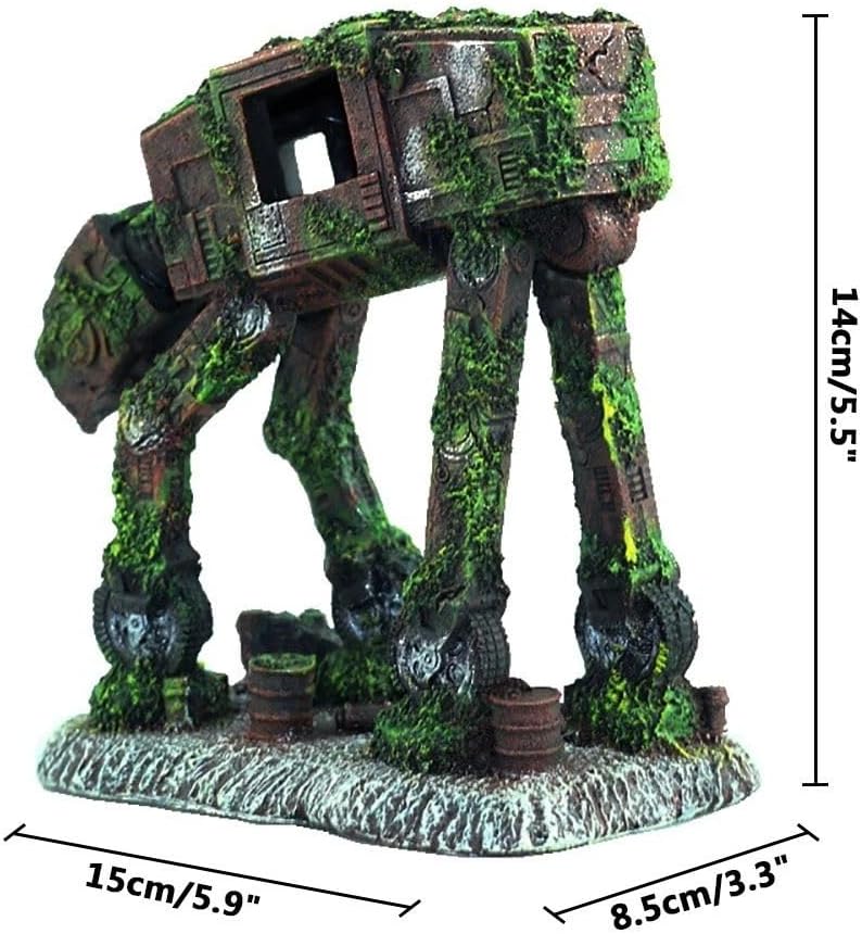 Transform your aquarium into a captivating post-apocalyptic underwater scene with this stunning mechanical walker decoration. Standing at 5.5 inches tall with a footprint of 5.9 x 3.3 inches, this detailed sculpture features the weathered remains of a robotic walker, artfully adorned with moss-like green accents that create a striking contrast against its aged metallic brown surface. The piece showcases intricate design elements including mechanical joints, worn panels, and window openings that add authenticity to its abandoned appearance. Perfect as a centerpiece or accent in freshwater or saltwater tanks, this unique decoration provides an excellent hiding spot and exploration area for fish while creating a fascinating sci-fi atmosphere. The durable construction ensures long-lasting performance underwater, while its realistic moss and rust effects make it appear as if it's been claimed by nature for centuries. This conversation-starting piece seamlessly blends industrial design with aquatic aesthetics, making it an ideal choice for enthusiasts looking to create an otherworldly underwater landscape.