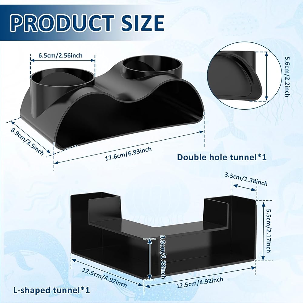 Transform your aquarium into an engaging underwater habitat with this versatile 2-pack of black aquarium tunnels. These sleek underwater structures serve multiple purposes - from creating natural hiding spots for fish and shrimp to establishing dedicated breeding areas. The contemporary design features both a rectangular tunnel and a dual-chamber curved tunnel, providing variety in your aquascape while giving your aquatic pets safe spaces to explore and rest. Perfect for fresh or saltwater setups, these durable decorative elements can function as breeding boxes, hatching rooms, or simply as aesthetic additions to your tank's landscape. The smooth black finish complements any aquarium design scheme and works beautifully alongside rocks, plants, and other decorative elements. These tunnels are ideal for small to medium-sized fish, creating engaging pathways that encourage natural behaviors while adding architectural interest to your underwater world. Easy to place and maintain, they're an excellent addition for both novice and experienced aquarium enthusiasts looking to enhance their tank's functionality and visual appeal.