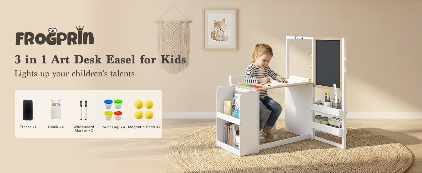 Rich Art Supplies: 3-in-1 kids art table and chair set combines a drawing desk, easel, and bookshelf, and comes with a roll of drawing paper, 5 chalk, 2 water-based pens, 4 paint cups, and a whiteboard eraser, allowing children to start creating art immediately upon receiving it. Notably, it also includes a drawing clip and 4 magnetic pins for displaying children's artwork. Designed to inspire creativity, drawing and learning, it provides a dedicated space for kids to explore their imagination.