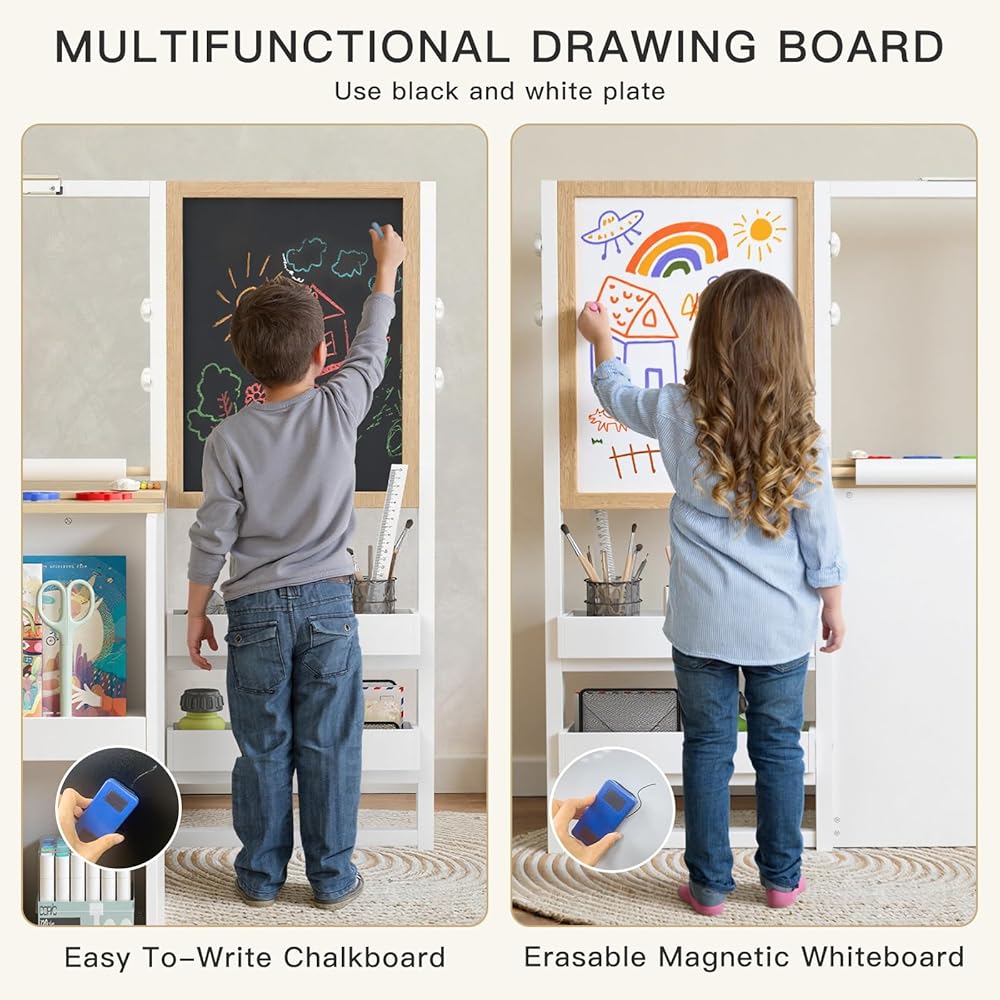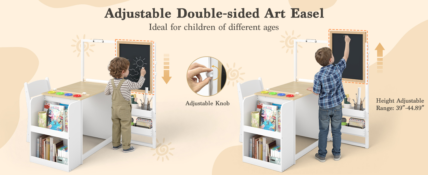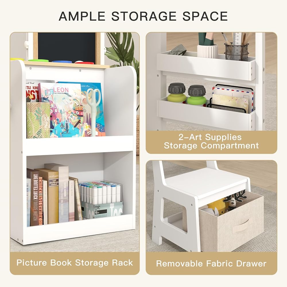 Ample Storage Space: Art table and chair set includes 4 storage compartments. A double shelf under the easel provides easy access to drawing tools. Movable storage compartments under the chair and a bookshelf on the side of the drawing table can be used to store children's artwork, toys, or books.