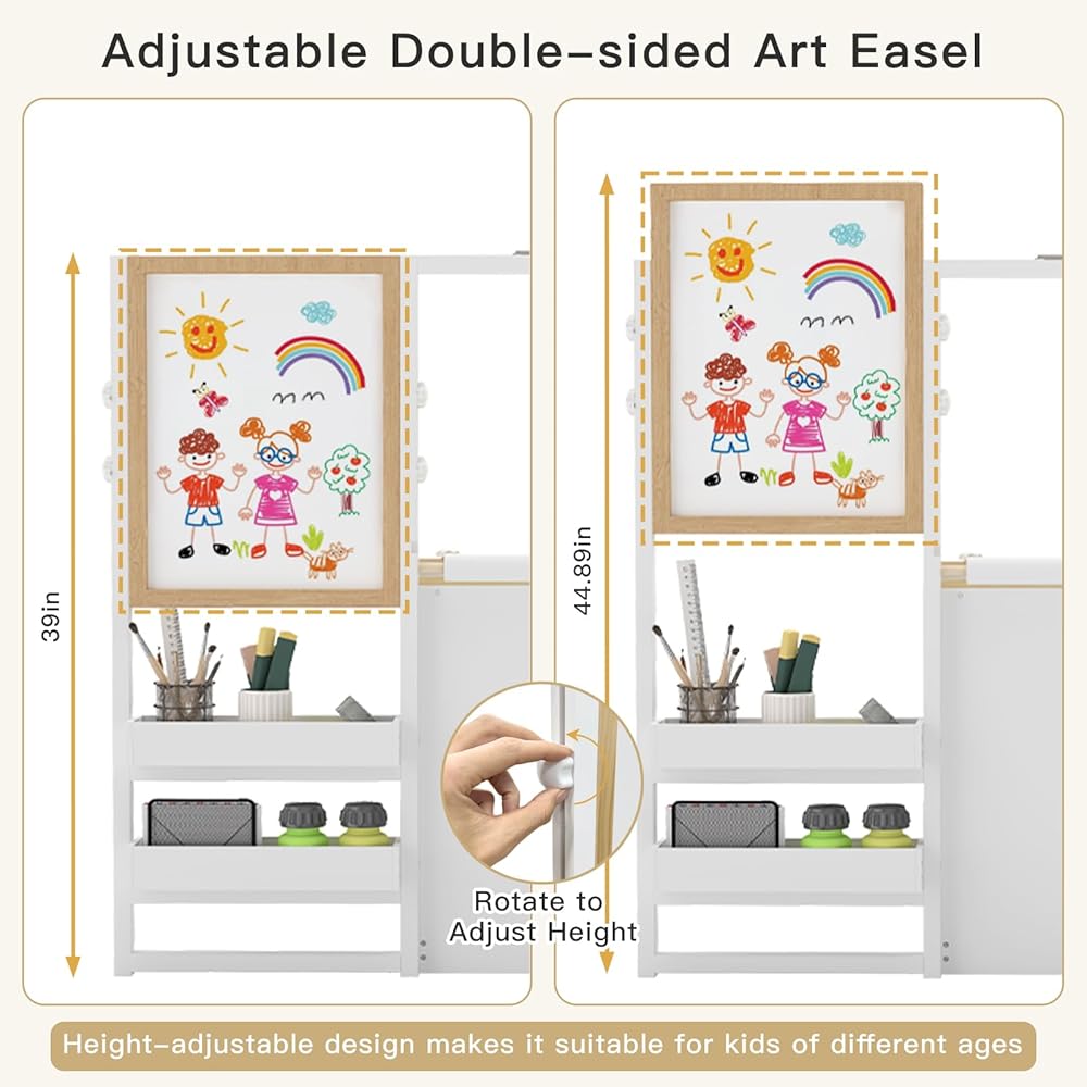 Adjustable Height Double-sided Easel: This children's art easel features a double-sided design, with a blackboard and a magnetic whiteboard, and comes with chalk and water-based markers. It also includes a blackboard eraser for easy cleaning. The height is easily adjustable, making it suitable for children ages 3 to 8. It grows with your child and supports proper posture during play and learning.