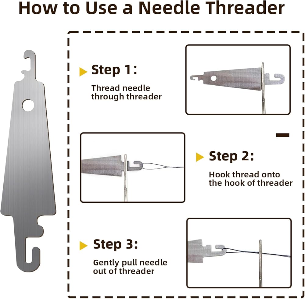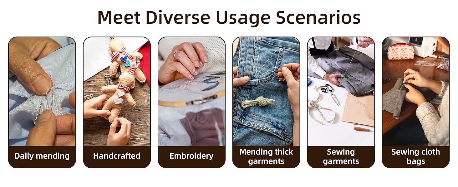 Stainless Steel Sewing Needles: Stainless steel needles for hand sewing has five sizes. Each needle features large eye,making threading incredibly easy when used with threader—a user-friendly design for all ages. Select appropriate steel hand sewing needles' size based on the fabric being sewn. With its' sharp points,steel sewing needles swiftly pierce through cotton, leather, denim, and other materials