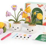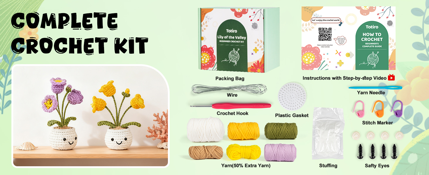 Complete Crochet Kit: Contains all essential supplies: 6 colors of beginner-friendly yarn, stuffing, safety eyes, an ergonomic crochet hook, yarn needle, stitch markers, wire, gasket, and step-by-step instructions with video. Nothing extra to buy, everything needed to create 2 adorable potted flower Amigurumi is included. An ideal crochet kit for beginners.