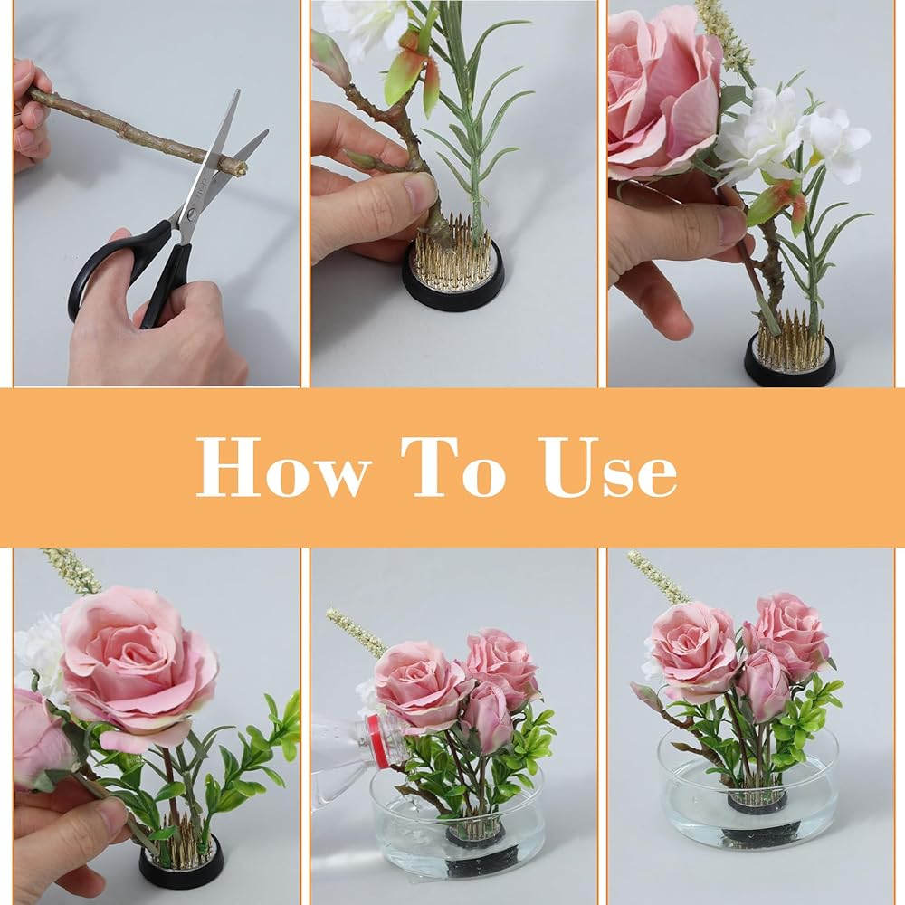 Use Method: These floral frogs for arrangements pins easy convenient to use, just insert stems plants on brass pins, then use sticky clay fix fixed tools container, it can be used to decorate