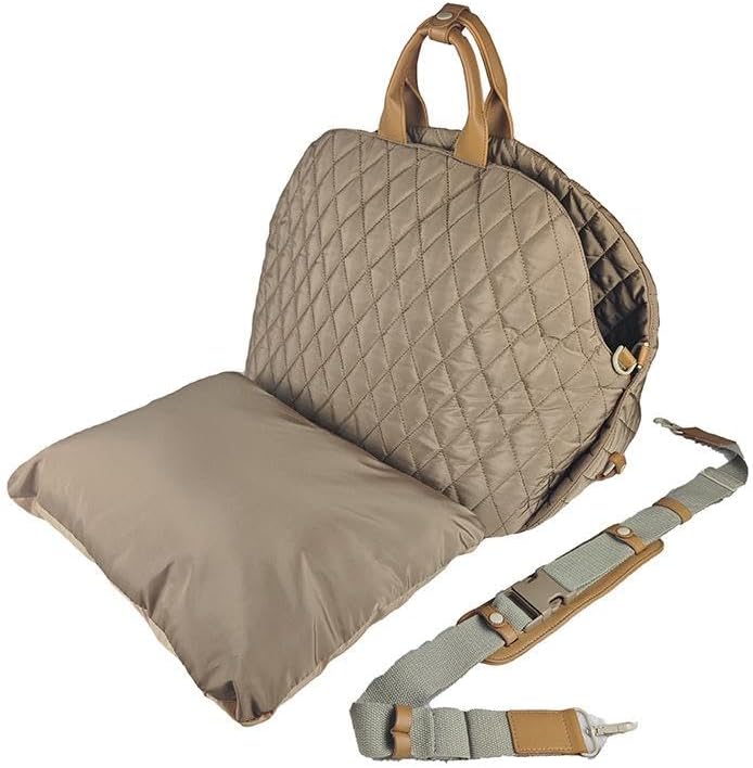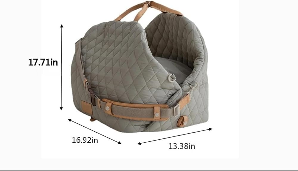 Transform your pet's travel experience with this luxurious quilted carrier that doubles as a car seat. Measuring 17.71 x 16.92 x 13.38 inches, this versatile pet bag features premium quilted padding throughout for maximum comfort and style. The innovative design includes sturdy straps and buckles that secure to your car seat, keeping your furry friend safe during drives. When not in use for car travel, it functions as an elegant portable carrier with comfortable handles and an adjustable shoulder strap. The sophisticated gray colorway with tan leather-look accents complements any interior, while the durable construction ensures lasting quality. Perfect for small to medium-sized pets, this foldable carrier offers easy storage when not in use. The deep, nest-like design provides a cozy space that helps pets feel secure whether on the road or out and about. Built-in safety features include secure closures and ventilation to ensure your pet's comfort and protection during every journey.