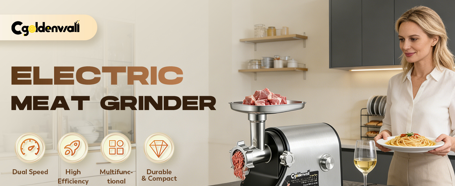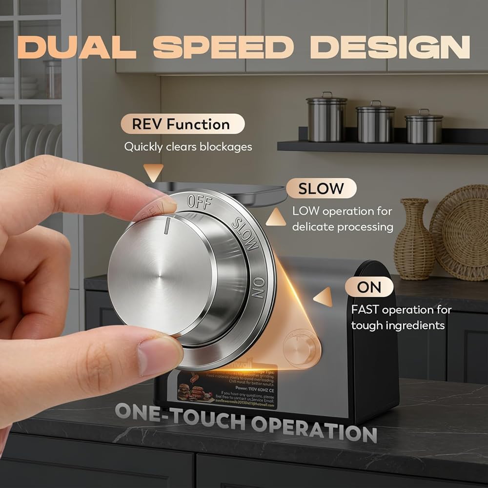 Speed Settings & Versatile Cooking: With speed settings, this home kitchen meat grinder offers precise control for different textures and recipes. The meat grinder and sausage stuffer's slow first speed is perfect for stuffing sausages, while the fast speed is great for grinding all types of meat. The reverse function helps to prevent jams. Ideal for creative cooking, and perfect for grinding, mixing, and making homemade sausages or specialty dishes. No more limited options—create a variety of dishes with ease and precision