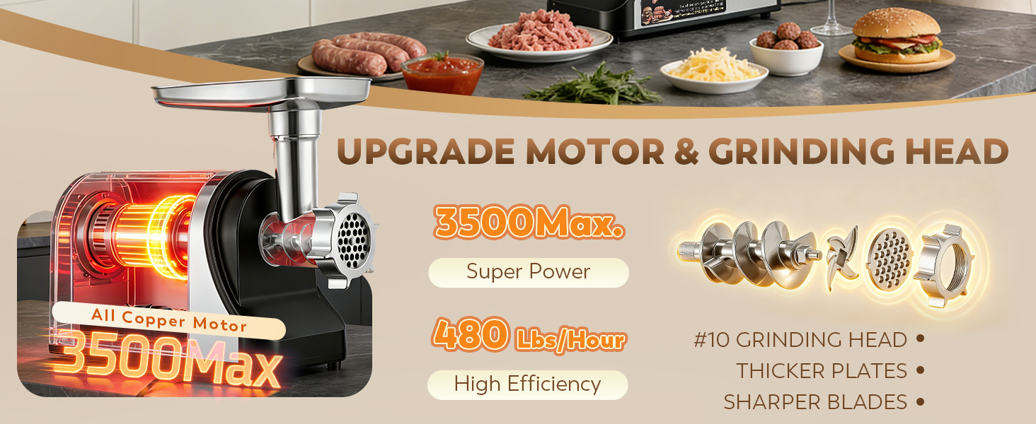 Upgrade Grinding Head: Electric meat grinder with an upgrade #10 Grinding head, 3 thicker & bigger SS grinding plates & 2 sharpper SS cutting blades to effortlessly grind tough meats like beef/pork/venison/turkey. Rifled head design smooths grinding even for larger pieces of meat. Large Bite Auger design brings in more meat at one go. Better Swirl for faster meat transit. Highly efficient food processing