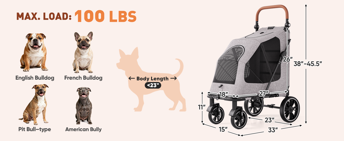 Heavy-Duty Support for Large Pets (Up to 100 lbs): This heavy-duty dog stroller is designed to safely transport large dogs, senior dogs, or multiple pets up to 100 lbs. Built with a reinforced steel tubing frame, it offers steady, wobble-free support and works as a smart alternative to carrying heavy dogs or forcing painful walks, especially during daily outings or recovery periods