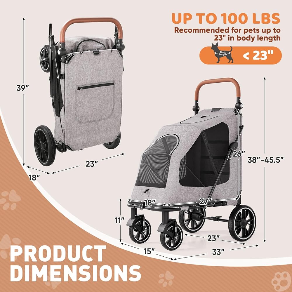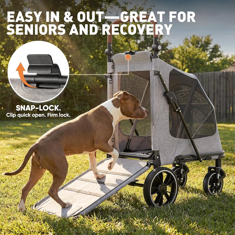 Magshion Heavy-Duty Dog Stroller for Large Dogs, Up to 100 lbs, with Ramp & Adjustable Handle, Dual Entry, Breathable Mesh, One-Step Brake, Storage Pocket for Senior Pets, Gray