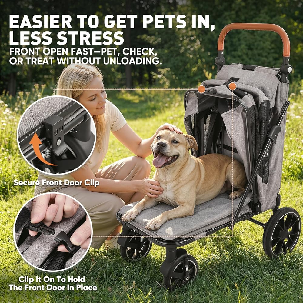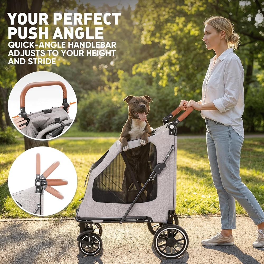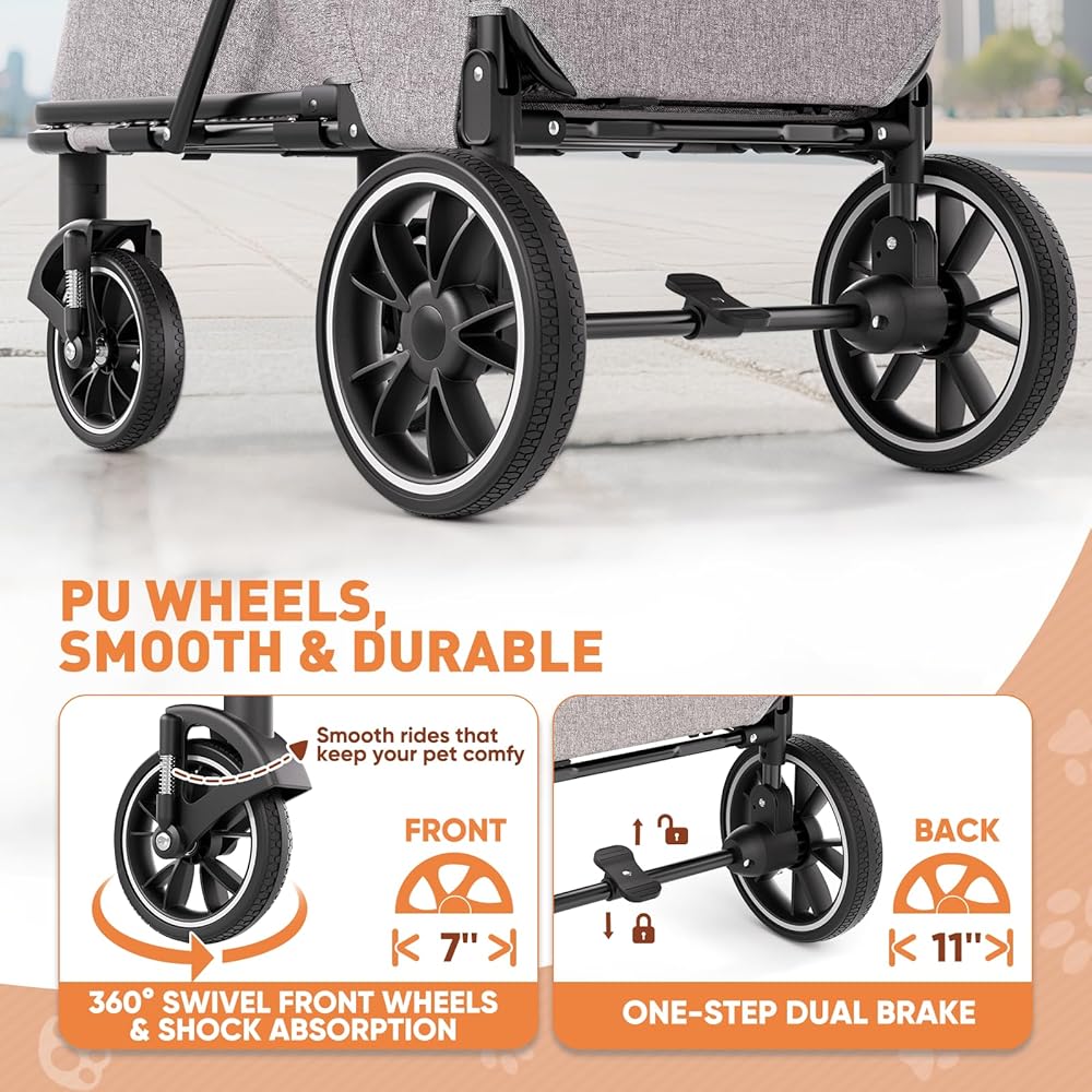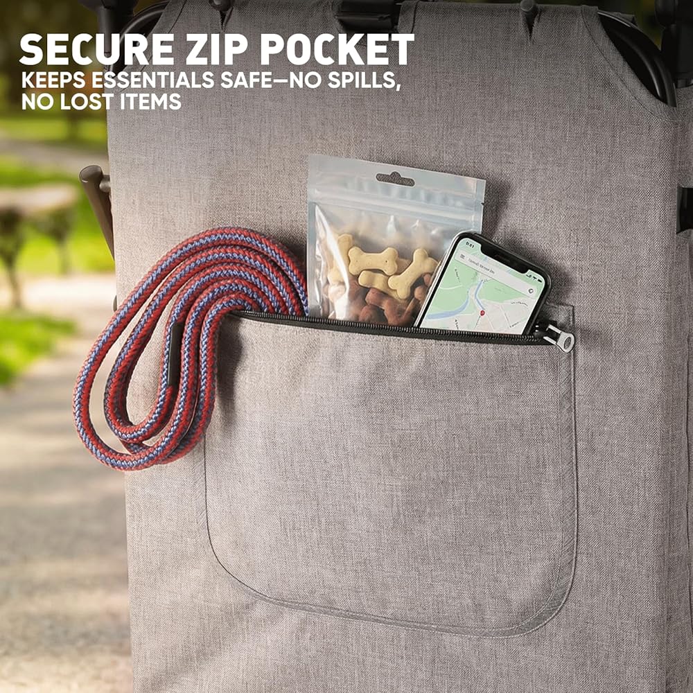 Smooth Ride on Real Terrain: Equipped with 7" swivel front PU wheels with suspension for soft turns and bump absorption, plus 11" oversized rear PU wheels that roll easily over sidewalks, grass, and uneven ground. Paired with a quick-adjust handlebar for your perfect push angle, and a rear zipper storage pocket for leashes or treats—this stroller is built for comfortable, everyday use