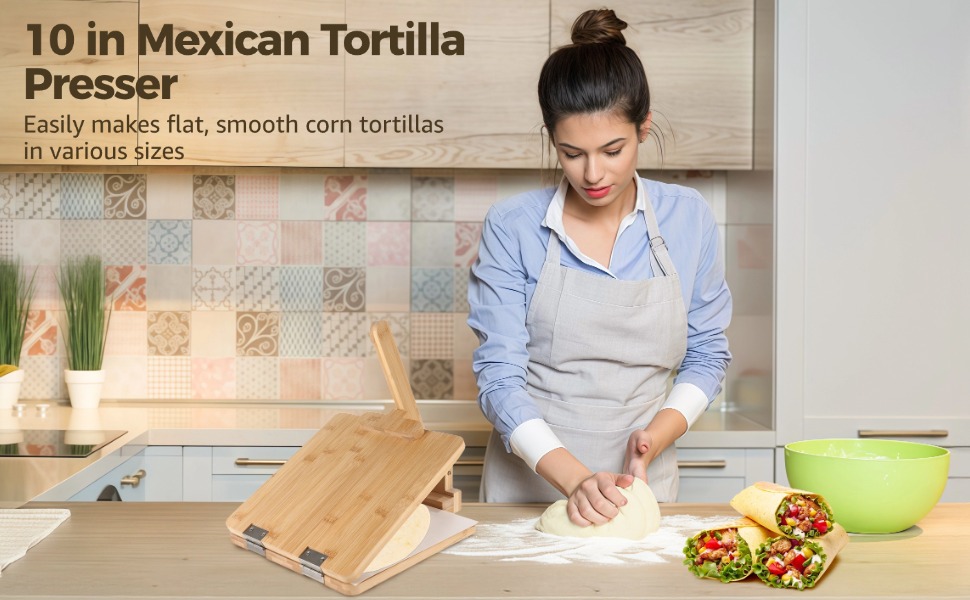 Wooden Tortilla Press, 10 in Mexican Tortilla Presser with Scraper & Papers, Natural Healthy Maker, Quick Shaping, Engraved with 4.5/6.5/8/10 in Scales, Easy to Use