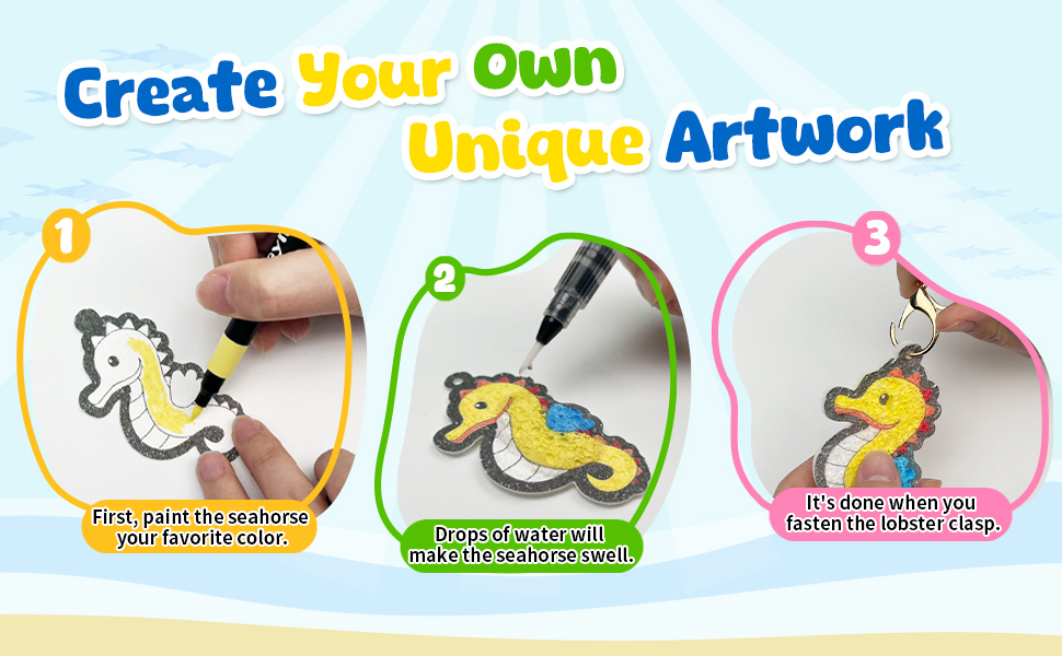 Complete Painting Kit – Includes 15 pcs foam texture papers, 12 vivid acrylic paint markers, 2 water brush pens, 6 keychains , 1 rope and 1 instruction. Everything you need to create is included.
