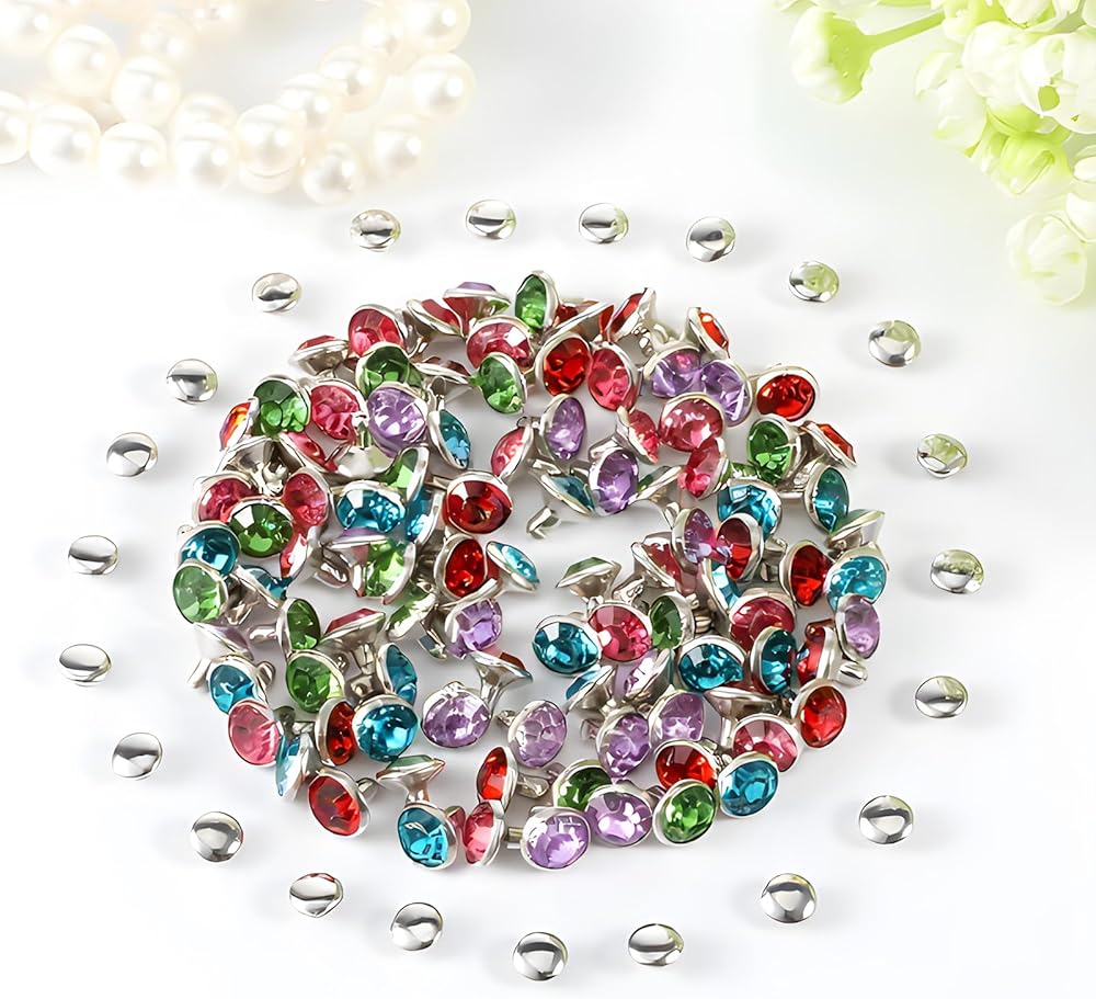 Package Contents: You will receive 100 sets of mixed-color crystal rivets, including rivet heads. The rivets are brightly colored, finely crafted, 8mm (0.31 inch) in diameter, and 6mm (0.23 inch) in head diameter