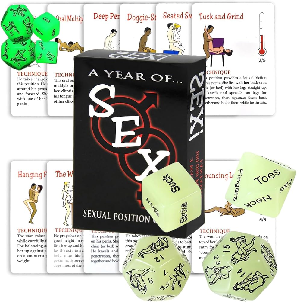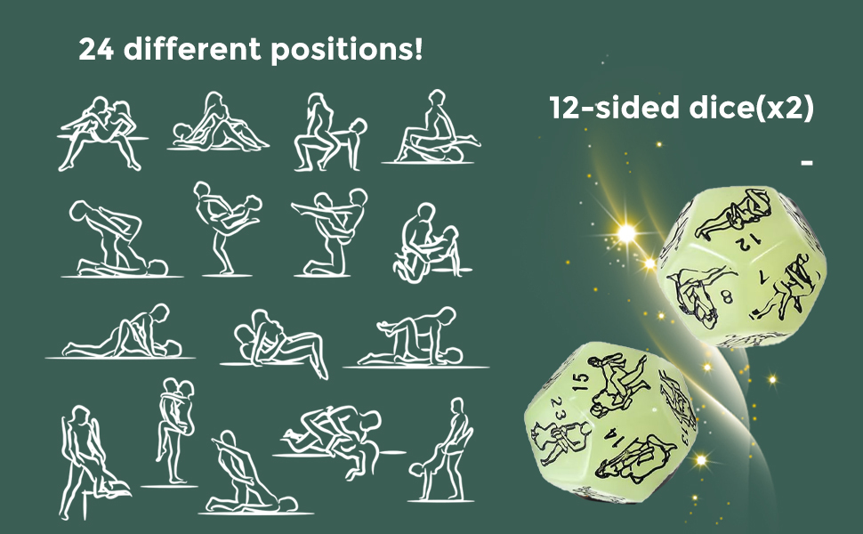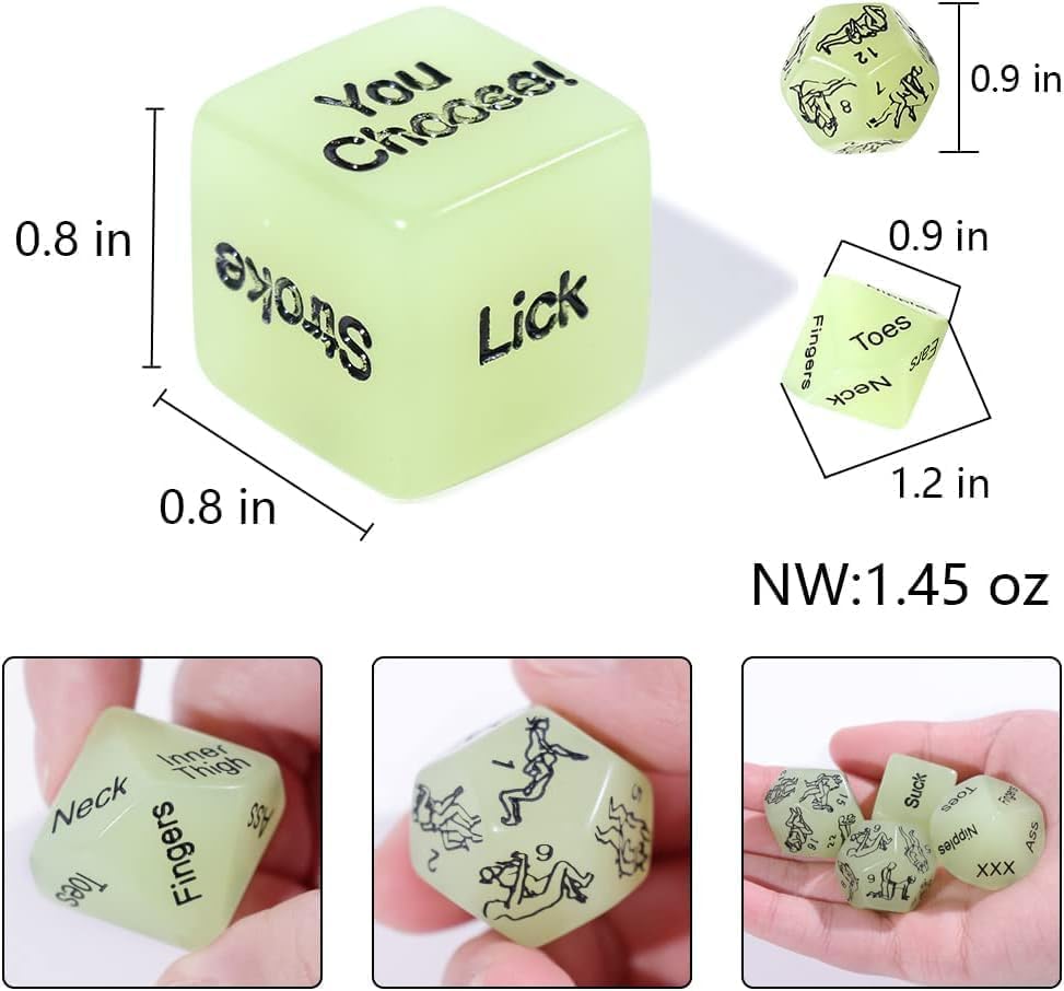π DICE β This exciting set includes 4 dice: two 12-sided dice with positions, one 10-sided dice with body parts, and one 6-sided dice with romantic actions. Designed with glow-in-the-dark material, these dice light up in low light, making them perfect for intimate play without turning on the lights.