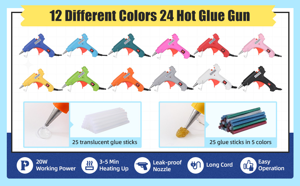 Glue Gun Kit: you will receive 24 pieces of craft glue guns in 12 different colors, including blue, red, sky blue, orange, white, pink, green, yellow, dark green, black, rose red, gray, come with 50 pieces of glue sticks, including 25 translucent, and 25 feature in 5 different colors, enough quantity and vibrant colors to meet your daily use and replacement needs