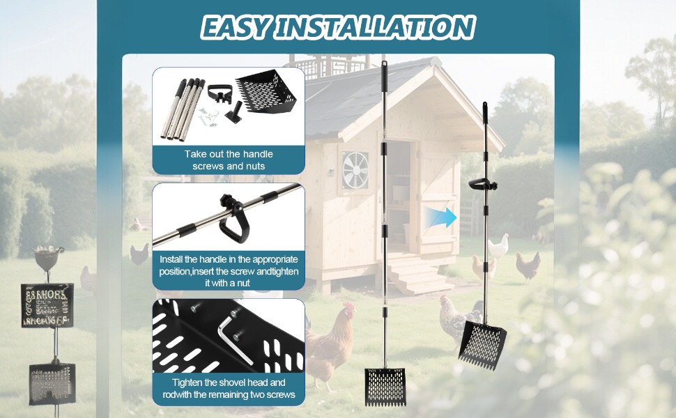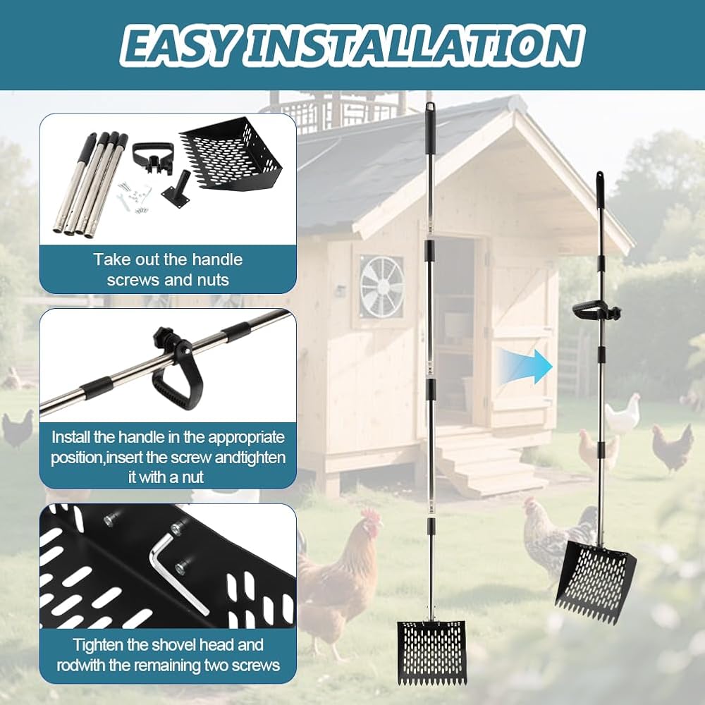 【Dual-Function Cleaning Power】Combines a sturdy rake and precision sieve in one tool for unmatched efficiency. Sharp tines effortlessly scoop up chicken manure, feathers, and debris, while fine mesh simultaneously separates waste from bedding—doubling cleaning speed vs. traditional tools. No more back-and-forth switching or manual sorting.