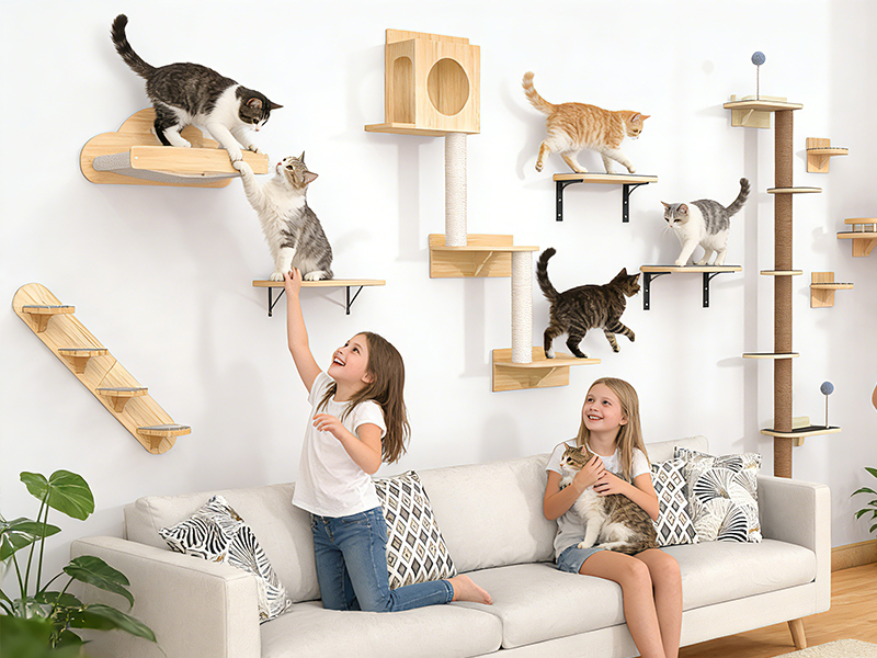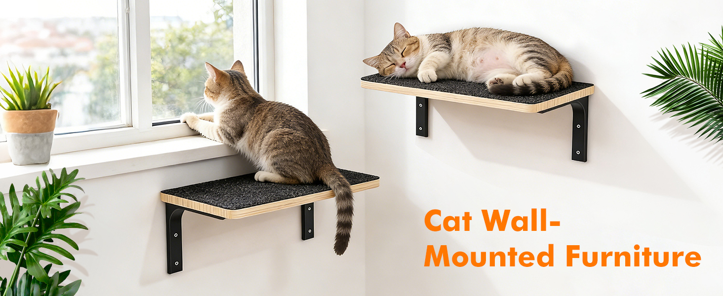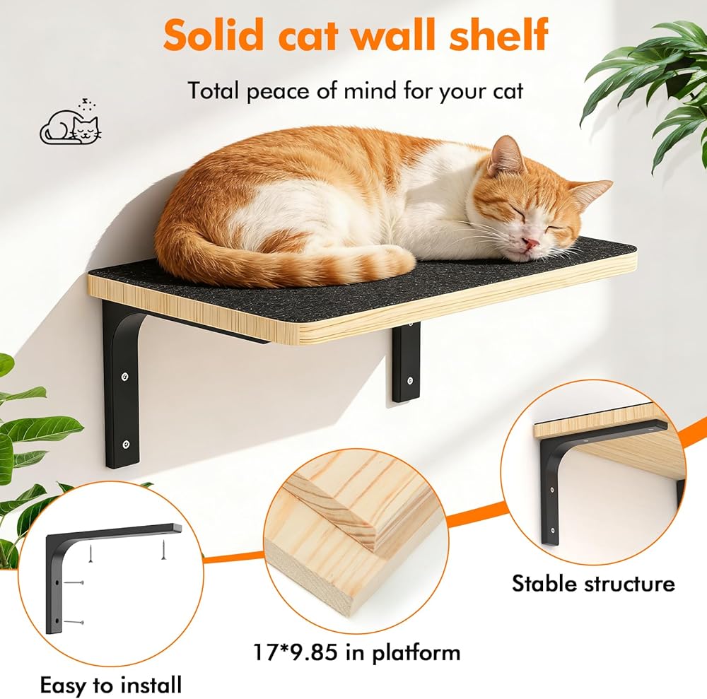 Sturdy shelves: The cat shelves' brackets are made of high-quality metal and have undergone rigorous load-bearing testing to ensure they can safely support the weight of cats. It can hold up to 44 pounds. The cat wall furniture satisfy your cat's natural instincts cats love observing their surroundings from high places. Wall-mounted shelves provide a sense of security, satisfy their instinct to climb and perch, and reduce their reliance on furniture.