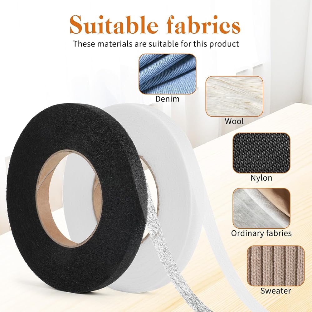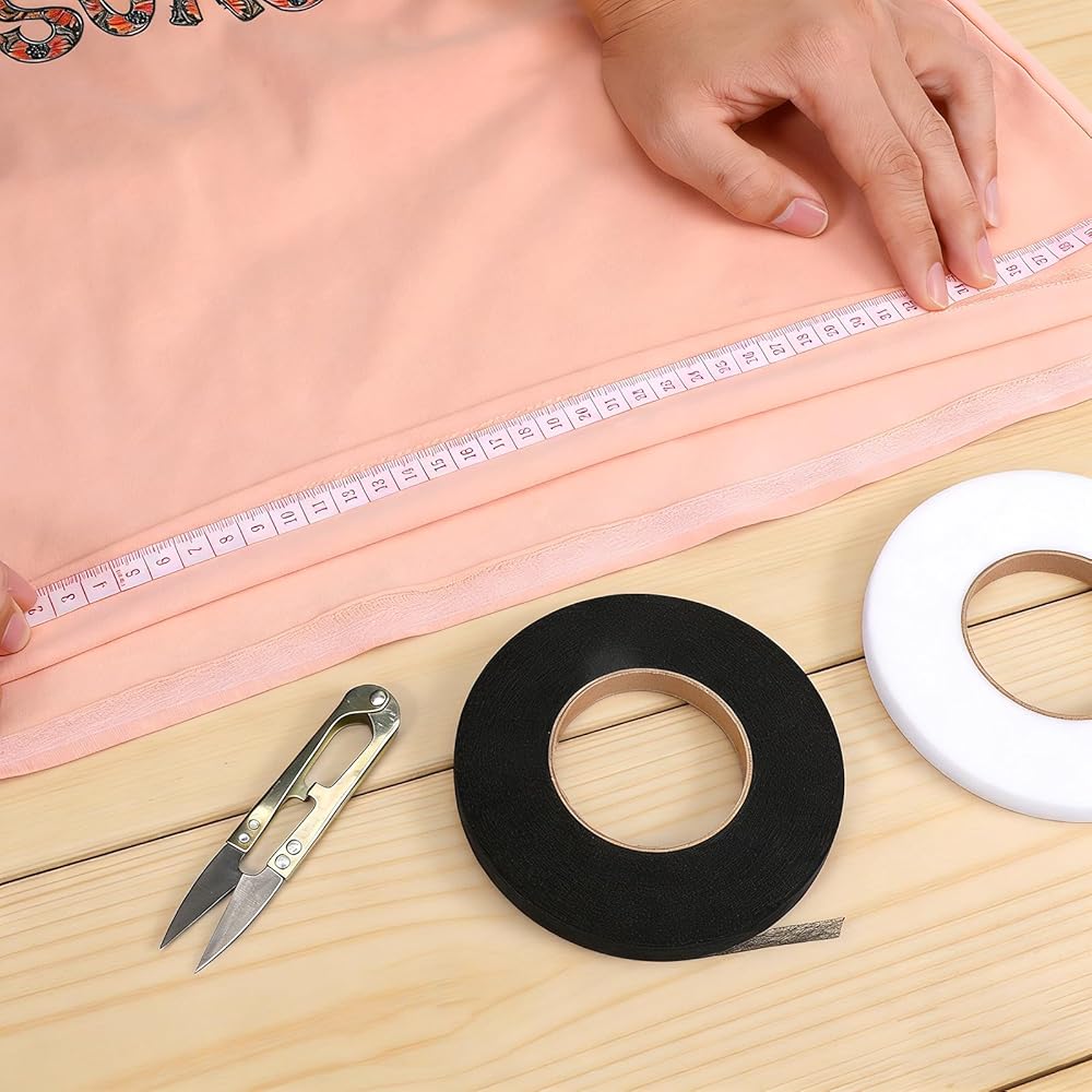 You Will Receive: 2 rolls of 0.59 inch width hem tape (70 yards each), measuring tape, and scissors for immediate use. The white and black fusible hem tape combination accommodates both light and dark fabrics. This stitch witchery kit provides all necessary tools for precise measuring, cutting, and application, ensuring professional results for beginners and experienced users alike