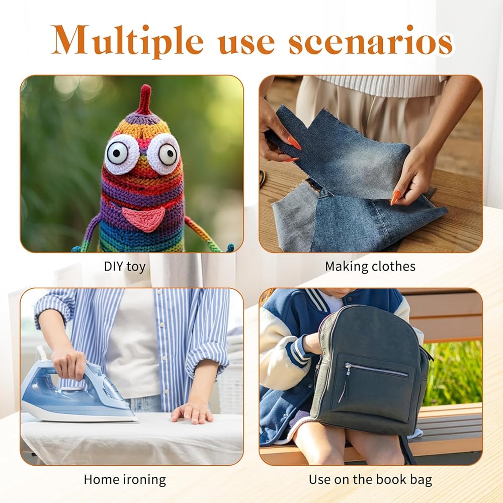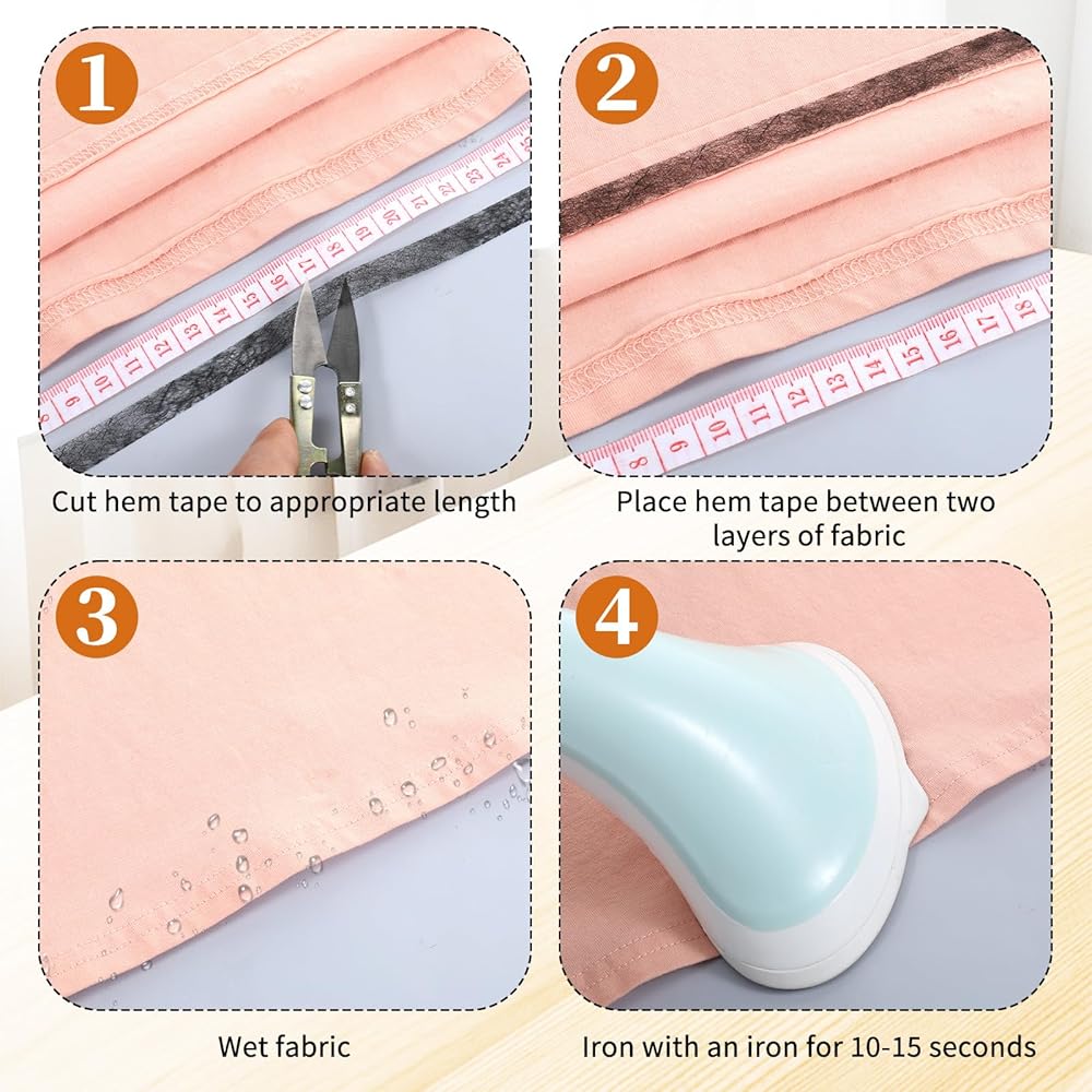 Easy Application: Preheat iron to 275-320°F, place hemming tape between fabric layers, moisten surface, and press for 10-15 seconds for secure bonding. The fusible hem tape features heat-activated adhesive that melts under iron heat, creating instant fabric bonds. Complete with measuring tape and scissors, this stitch witchery sewing tape simplifies the hemming process for users of all skill levels