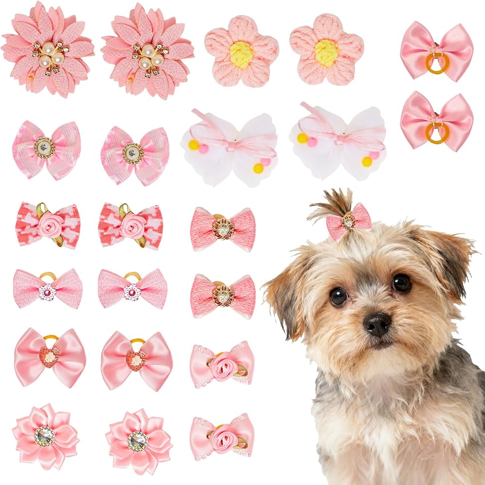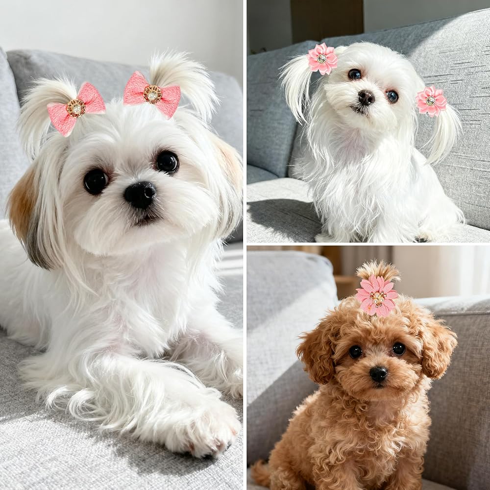 • CUTE PET PUPPY HAIR BOW SET: This dog bow set includes 20 pieces/10 pairs of different styles of bow hairpins, equipped with artificial rhinestone dog hair bows, pearl flowers, lace bows and so on., very cute.