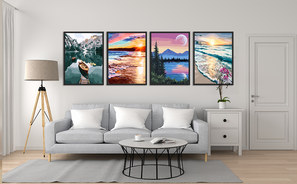 WHAT YOU WILL GET:4 pc pre-printed textured art canvas (without framed),4 set acrylic paints,4 set paint by numbers brushes(include 3pcs).and paint by number accessories,hook + number drawing paper guide.size:12” x 16”