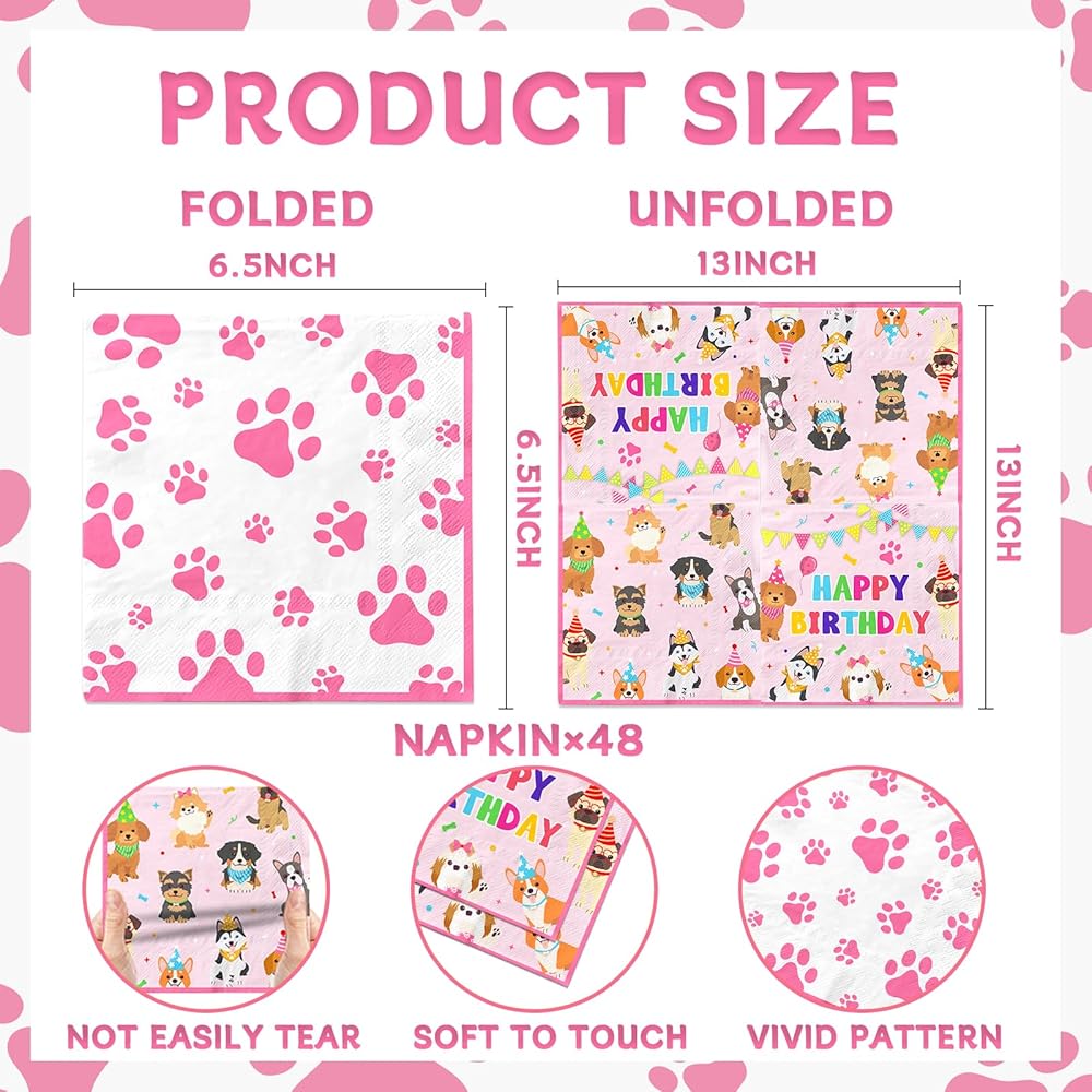 Dog Themed Design: This pink dog birthday party napkins pattern is different cute pet dog and paw, with the words "HAPPY BIRTHDAY" printed on the napkins. Decorate kid's or dog birthday party with these dog napkins, which is also suitable for girls baby shower