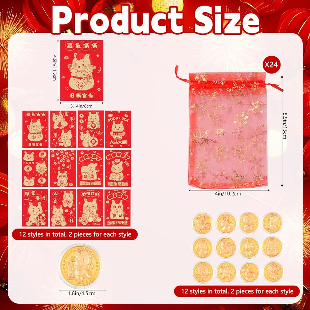 Size: Each Lunar New Year red envelope measures approximately 4.5 x 3.14 inches; each Year of the Horse commemorative coin is approximately 1.8 inches in diameter; each red storage bag measures approximately 4 x 5.9 inches long and 3.94 inches/10 cm wide. The spacious red gift bags are perfect for wrapping and decorating personal and family gifts during the Year of the Horse, and also suitable as Lunar New Year gifts and bulk gifts