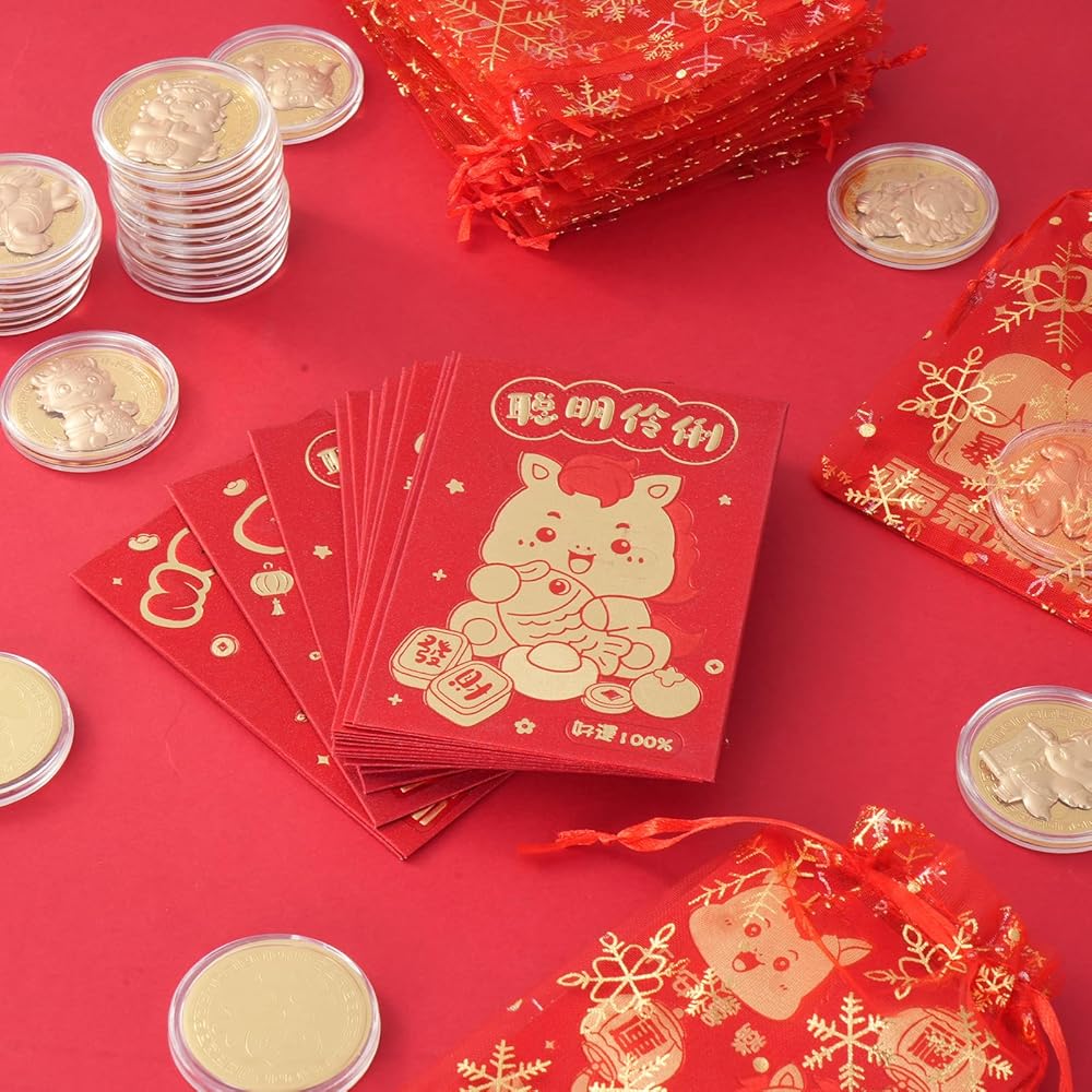2026 New Year Gift: This Chinese Lunar New Year gift set includes 24 * Chinese horse coins, 24 red gauze drawstring bag and 24 Chinese New Year of the Horse red envelopes. Ample quantity and beautiful arrangement, this New Year gift set meets your everyday needs and is an ideal gift for colleagues, friends, family, or peers. It also makes a perfect New Year decoration for the 2026 Spring Festival