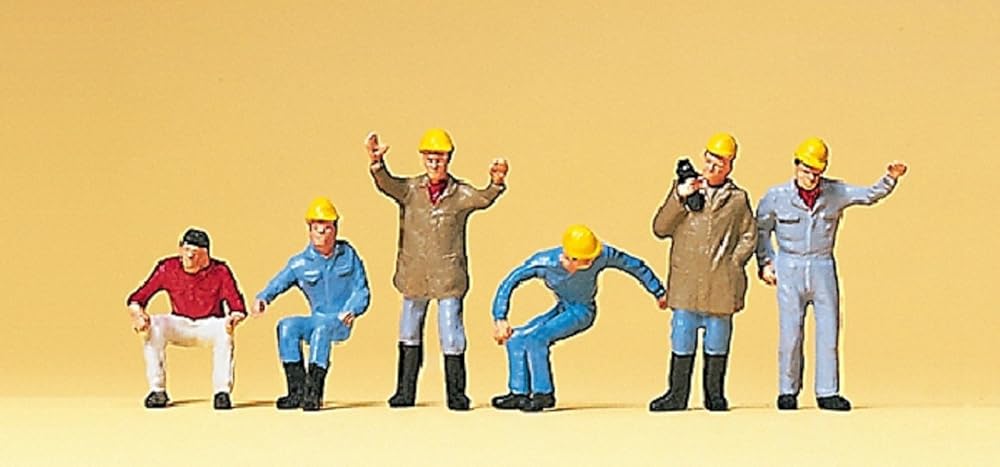 Manufacturer: Preiser Art.-No. 10037 EAN: 4041032100371 Gauge H0 1:87 Crane personnel Miniatur figures made of plastic, carefully hand painted; exclusive series. Average height of a standing human figure: approximately 21 mm. Set of 6 individual figures. Colors different, Zoom picture shows original article!