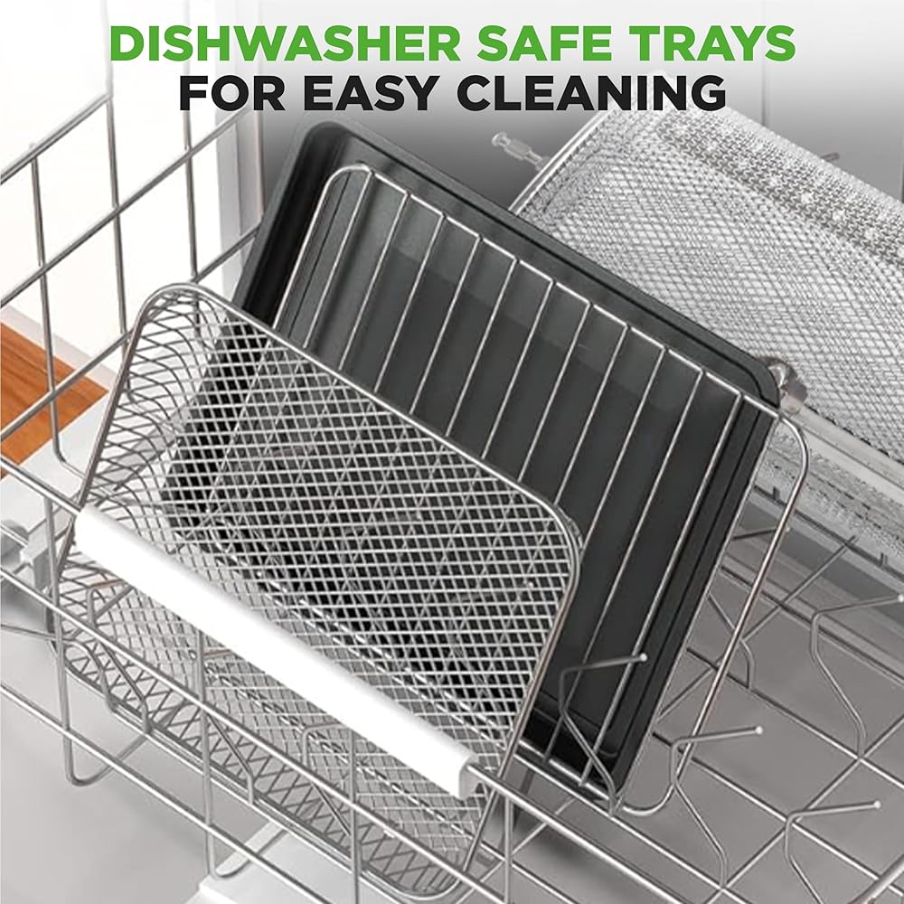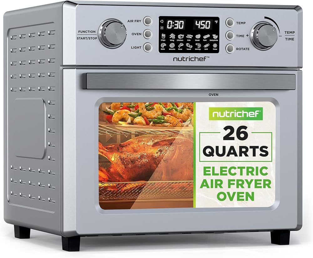 Introducing the 26L Electric Air Fryer Oven, a sleek and powerful kitchen essential that brings versatility to your cooking routine. With 1700 watts of heating element, this countertop rotisserie combo offers 10 digital quick menu presets, including Air Fry, Toast, Bake, Broil, Roast, Reheat, Warm, Slow Cook, and Dehydrate. Its non-stick, easy-to-clean design and adjustable temperature control (up to 400°F) provide precise cooking, while the automatic shut-off and overheat protection prioritize safety. The 360° hot air circulation technology ensures quick and even cooking with minimal oil, and the compact size allows for easy storage. Equipped with a high-definition LED touch screen and transparent window, this air fryer oven delivers a seamless cooking experience. Complete with a dishwasher-safe tray and a comprehensive accessory package, it's the perfect appliance for those seeking a healthier and more efficient cooking solution. Elevate your kitchen with the 26L Electric Air Fryer Oven – where innovation meets culinary excellence.