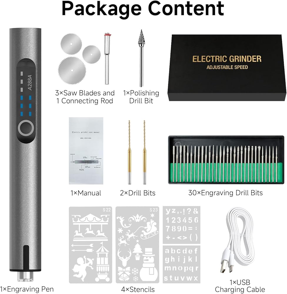 【Complete Engraving Kit with All Accessories】 This all-in-one engraving pen kit includes the pen, USB-C cable, 30 engraving bits, drill bits, saw bits, polishing head, connecting stick, and stencils—ready for engraving, cutting, grinding, and more.