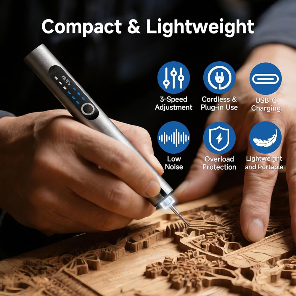 【Quiet, Ergonomic & Beginner-Friendly Design】 Designed for low-noise operation, it lets you focus without disturbing others. The lightweight, ergonomic body ensures comfort and precision, making this engraving tool ideal for both beginners and experienced makers.