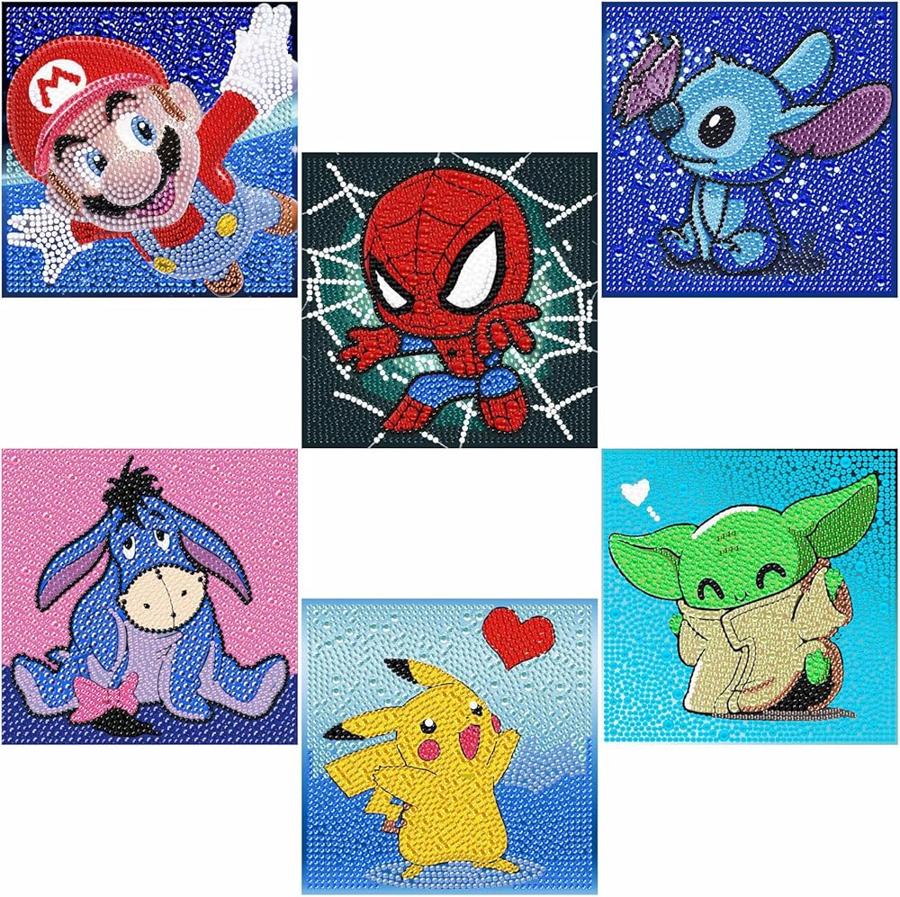 LWZAYS 6 Pack 5D Cartoon Diamond Painting Kits for Kids Beginners, Diamond Art Kit for Kids Ages 8-12, Mosaic DIY Full Round Drill Big Gem Art for Kid, Home Wall Decoration 6X6 inch