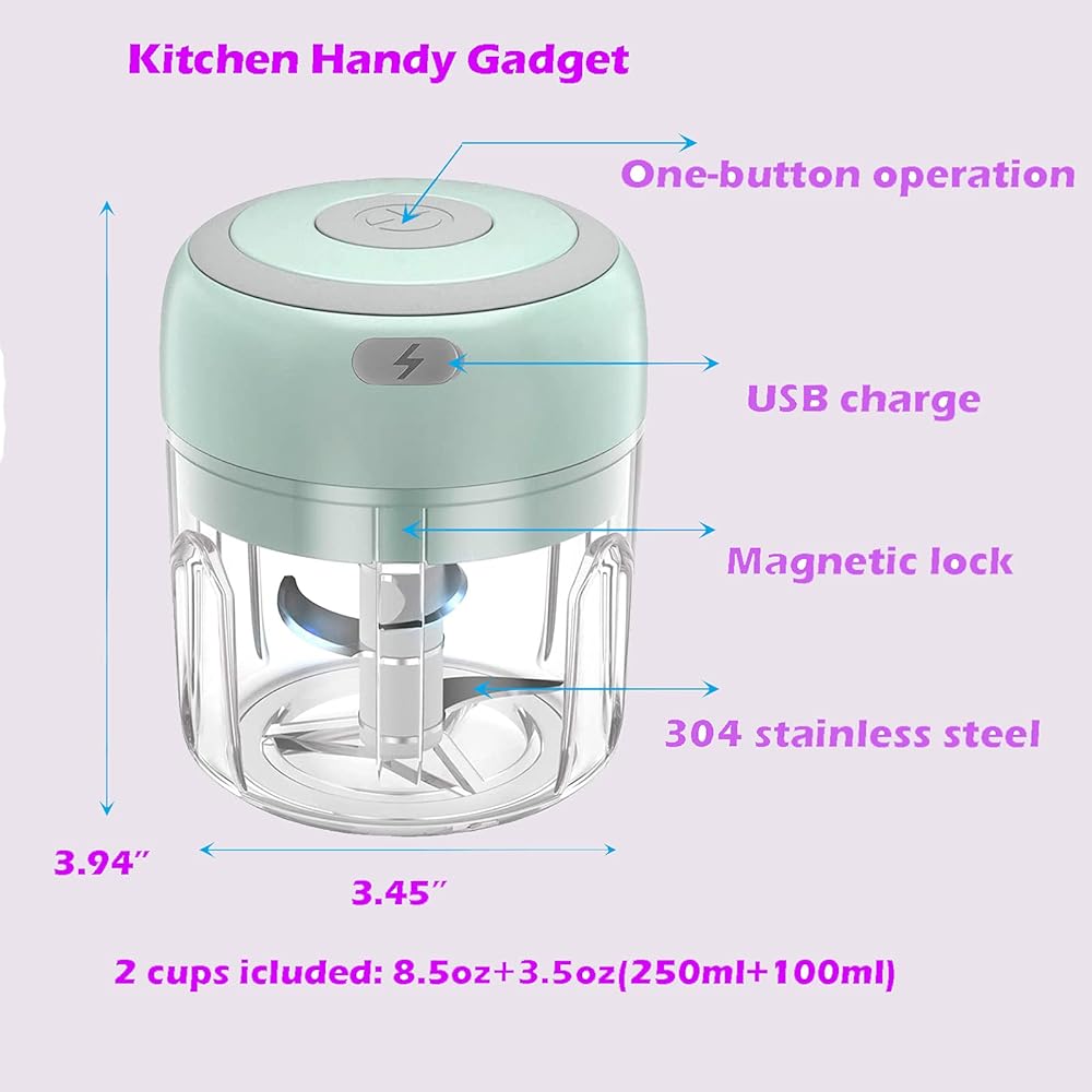 Package included: 1 main engine 2 sets of blades 2 cups(8.5oz+3.5oz) 1 USB charging cable 1 product instruction. Tips: 1. Please fully charge the garlic chopper for the first use(about 3 hours). 2. Recommend cutting the large pieces of projects into smaller pieces before use. 3. Avoid projects that too hard, like boned meat, coffee beans. 4. For safety, please stop using the chopper during charging.