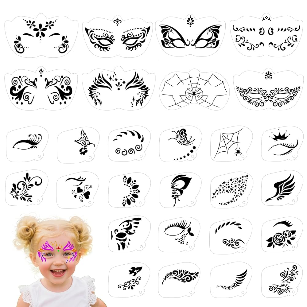 PACKAGE CONTENTS: The facial painting set includes 28 unique face paint stencils, 8 pieces reusable large face paint stencils, and 20 pieces small face paint stencils for kids, featuring diverse designs from simple shapes to intricate patterns for creative body art.