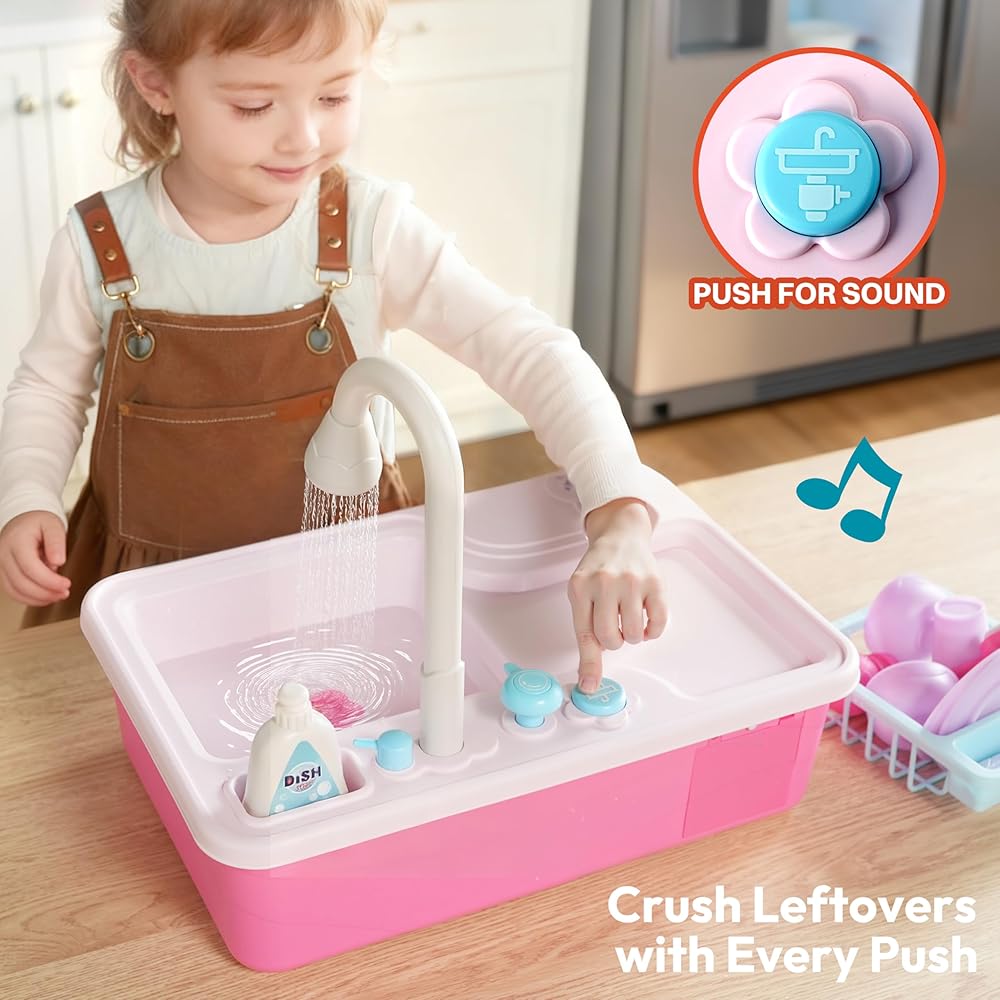 Chopping & Dishwashing Fun: Press the button for realistic chopping sounds while sanitizing food pieces in the kitchen sink. Rinse and wash utensils with a drying rack for a complete pretend and play experience