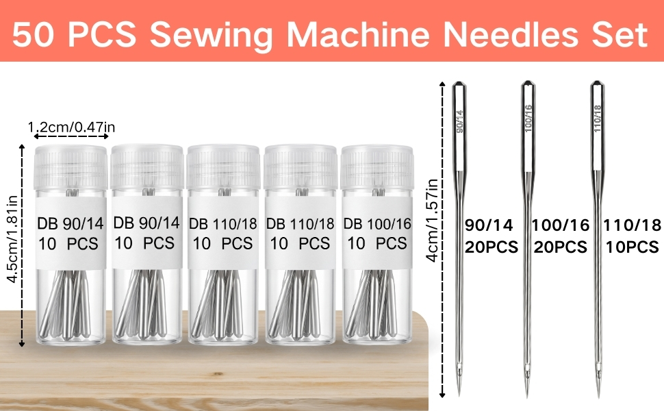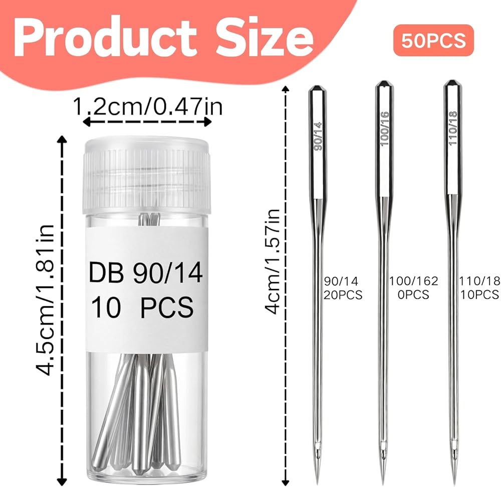 50-Piece Sewing Needles Kit for Home Use:Includes 20×90/14, 20×100/16, and 10×110/18 premium sewing needles—ideal for beginners and experienced sewers alike