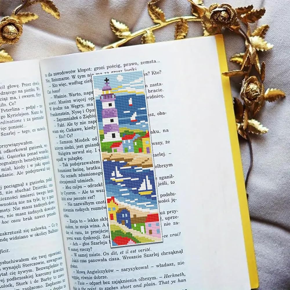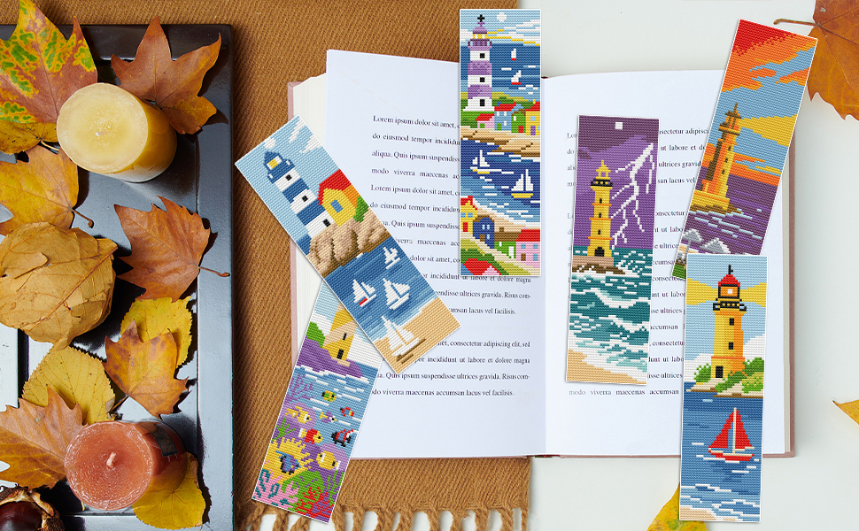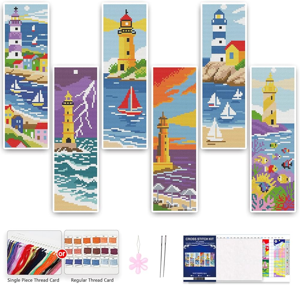 6 Set Bookmark Cross Stitch Kits Stitch with Instructions Lighthouse Summer Scenery Pattern 14CT Cross Stitch Kit for Beginners and Craft Enthusiasts Bookmark Accessories or Gifts,8'' x 2.4''