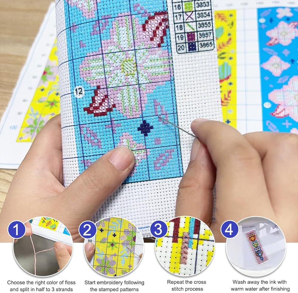 EASY TO FOLLOW PATTERN: The bookmark fabric features a clear and simple pattern that guides you through the process, suitable for beginners and experienced stitchers alike. Choose the right color of floss and split inhalf to 3 strands, start embroidery following the stamped patterns, repeat the cross stitch process, wash away the ink with warm water after fnishing.(The product can be glued on top of a sticky felt board after embroidery and will not fall apart.)
