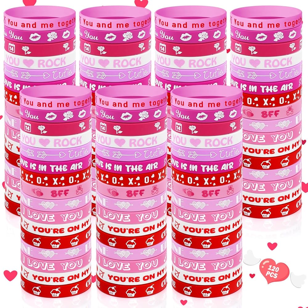 120 PCS Valentine Bracelets Rubber Bulk Valentine's Day Heart Silicone Wristband Valentines Day Accessories for Valentines Day Gifts Exchange Wedding Party Favors Decoration (120)