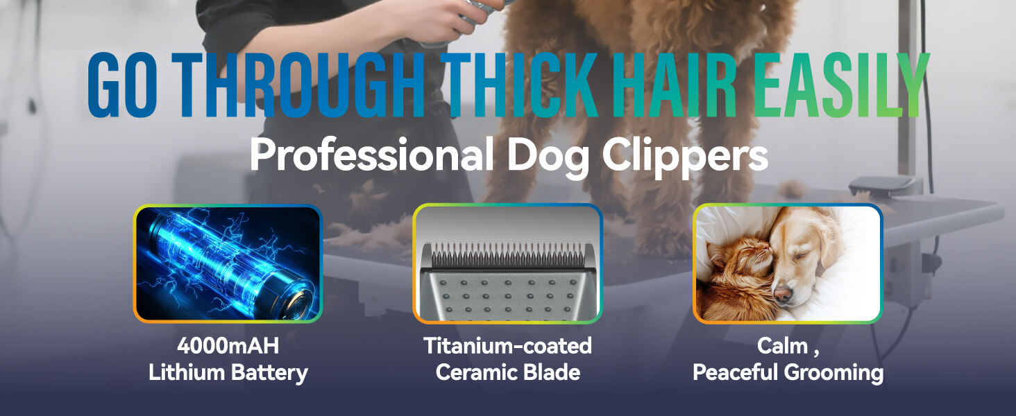 Cuts Fast & More than 12H Long-Lasting : The blade head of FOGOSP professional dog clippers for grooming is made of Japanese 440C steel (fixed blade) and titanium-plated ceramic moving blade. The precise sharp-edged blade head ensures faster and cleaner cutting without damaging the fur. It is equipped with a 4000mAH high-efficiency lithium battery. After charging for 3 hours, dog clippers can work for 12 hours. It's more useful than you can imagine.