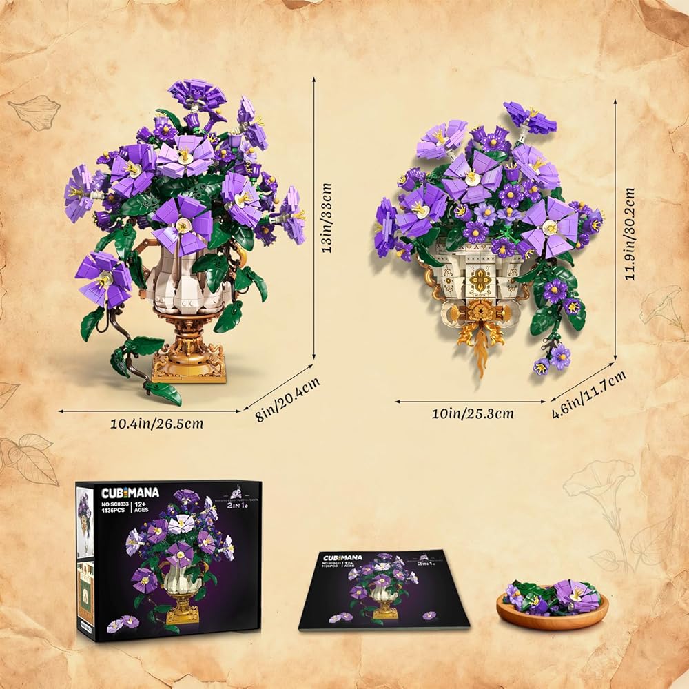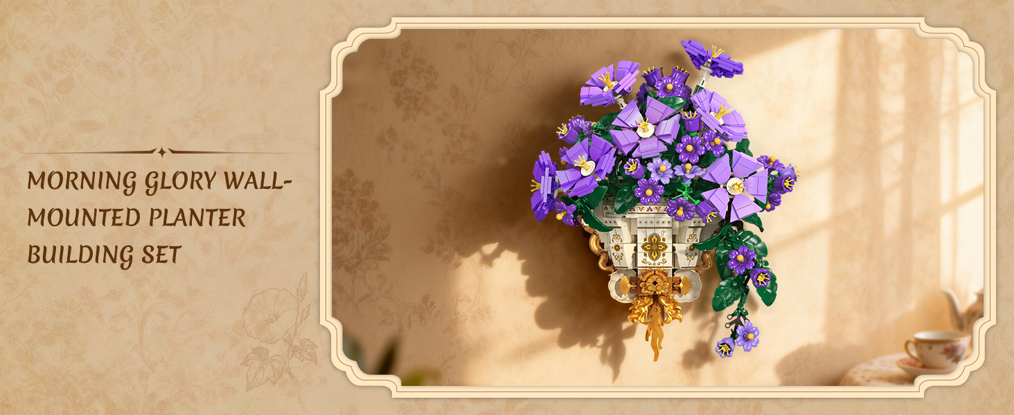 FROM TABLETOP TO WALL ART - Blending nature's elegance with architectural creativity. This 2-in-1 flower building kit transforms from a lifelike potted morning glory to a vintage wall decoration flower pot, celebrating the duality of indoor greenery. Start with a lovely plant bonsai, then reimagine it as a Morning Glory wall-mounted flower pot. Dual styling options mean double the decorative impact.(Friendly reminder: It is recommended to use it with thin nails when hanging.)