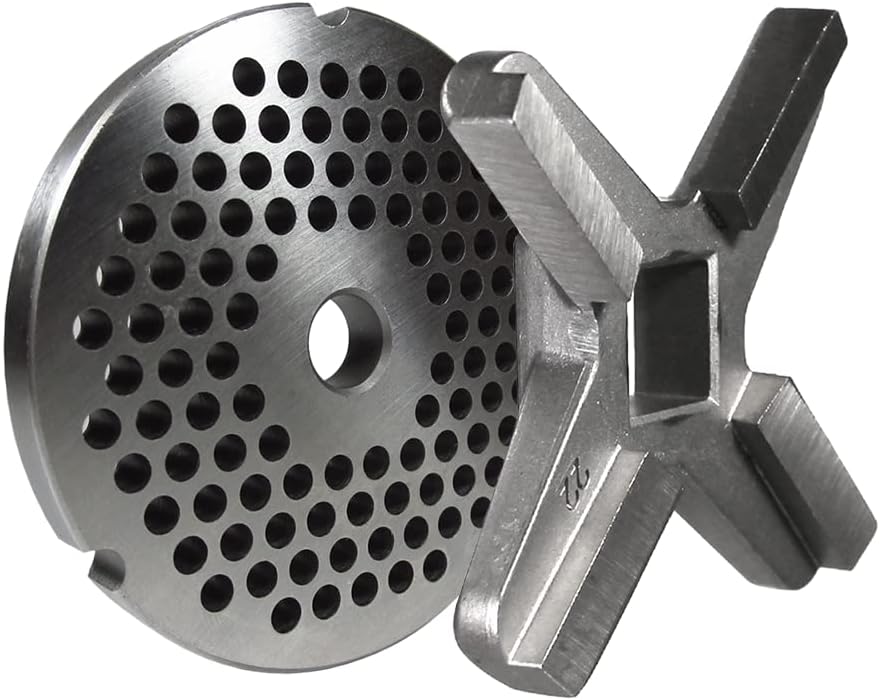 Replacement #22 grinder plate and knife. Fits most size #22 machines using a standard reversible plate. The plate has 3/16" (4.7 mm) holes that is ideal for medium grinds such as hamburger, sausage, etc. The knife is a long lasting raised edge knife. The raised edge cuts better and lasts longer.